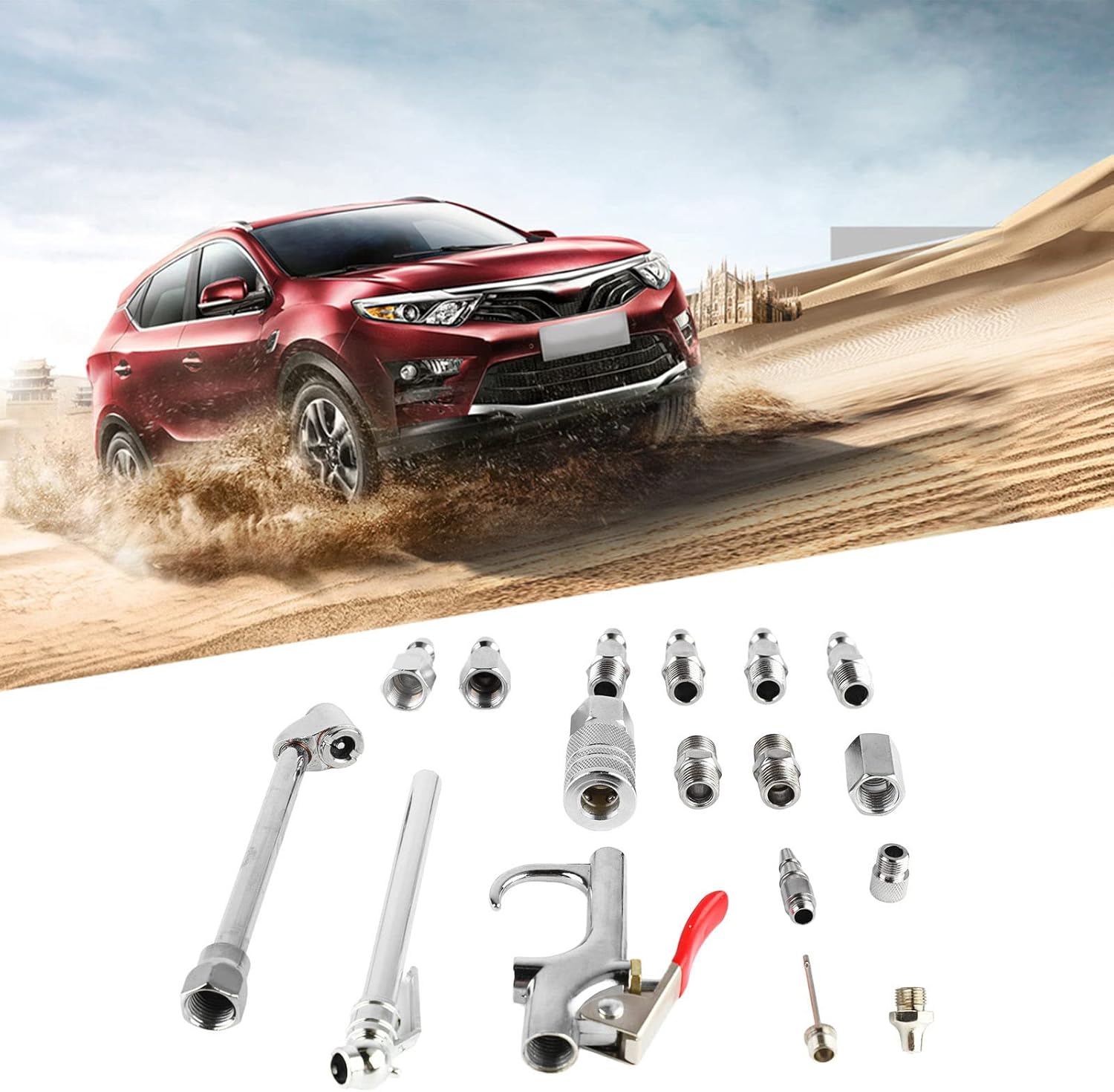 Specification: Item Type: Air Blow Gun Accessory KitMaterial: IronUse: 17 piece set of 1/4NPT US style quick connector dust gun inflation rod tire pressure gauge Package List: 1 x Dual Foot Chuck 1 x Tire Gauge 1 x Blow Gun 1 x Conical Inflator 1 x 1/4in FNPT Coupler and Female Coupler 2 x 1/4in FNPT Plug 4 x 1/4in MNPT Plug 2 x Male Connector 1 x Female Coupling 1 x Safety Nozzle 1 x Adapter 1 x Inflation Needle