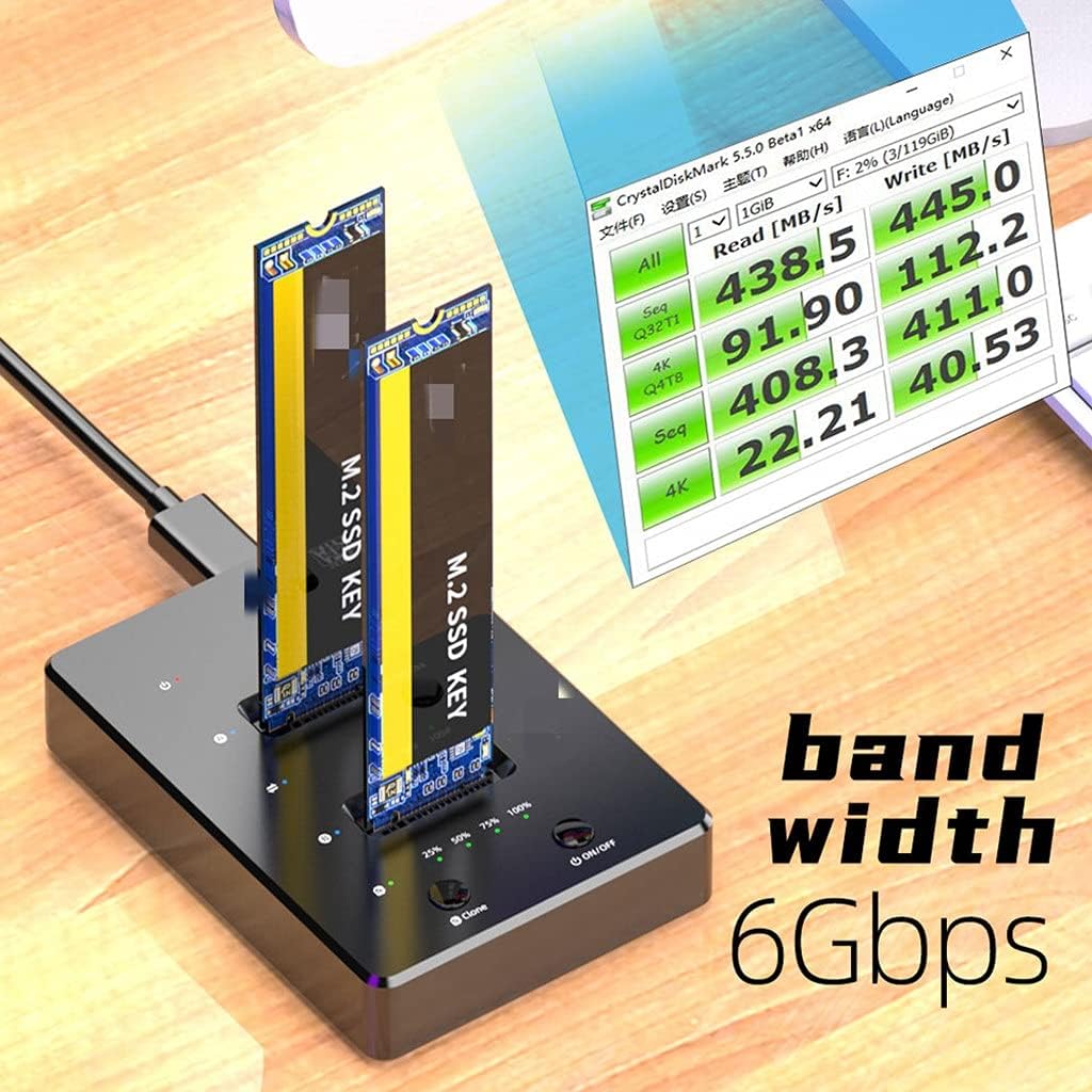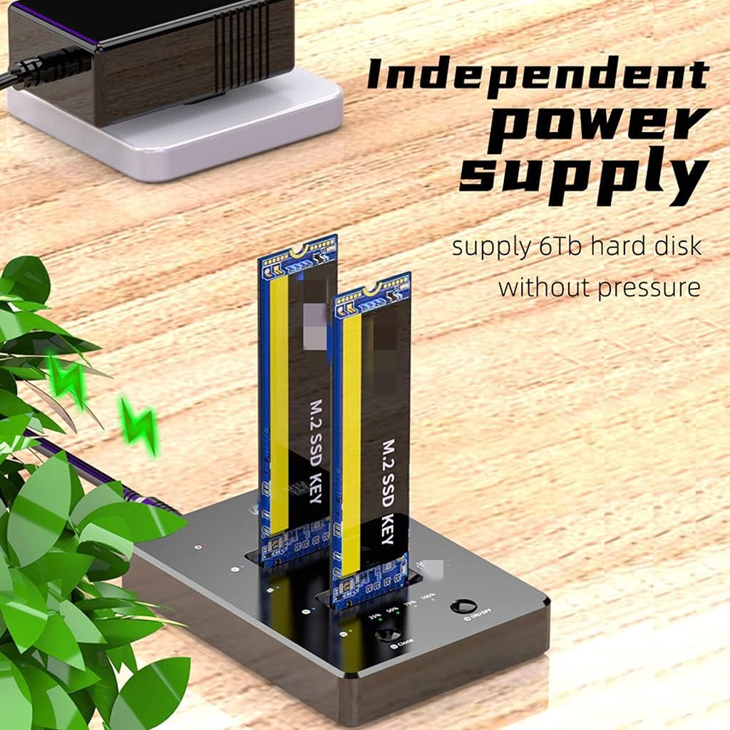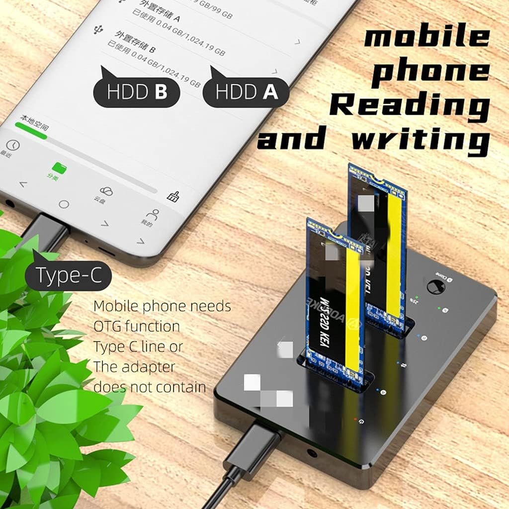 Transmission interface: Type C(6Gbps bandwidth)Read write support: two M.2 SATA 2TB hard drivesHard disk support: SATA protocol M.2 SSD solid state diskSupport for cloning: 1:1 full offline cloningCloning standard: the capacity of A source disk should be less than or equal to that of B target diskProduct material: aluminum alloyColor: BlackSize: 60X85X16mmPackage list:1x HDD Docking Station