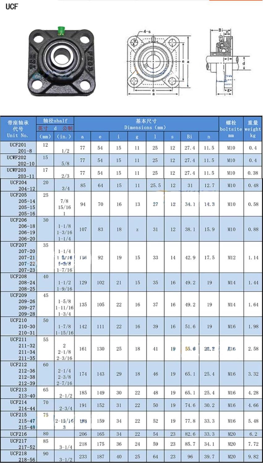 Product description:UCF205-208 Pillow Block Bearing 25-40mm Bore Square Flange Mounted Self-Alignment Pillow Block BearingsMaterial: Cast iron housing, chrome steel insert bearing. Smooth and low noise, easy to install. Simple installation and easy maintenance lubrication system.Feature: Widely used in machinery and equipment with mechanical stops for applications with high requirements for shaft center position. Strong sealing, waterproof, dustproof, mud proof, increase the service life of the bearing, precision workmanship, corrosion resistance Package Including:1Pcs