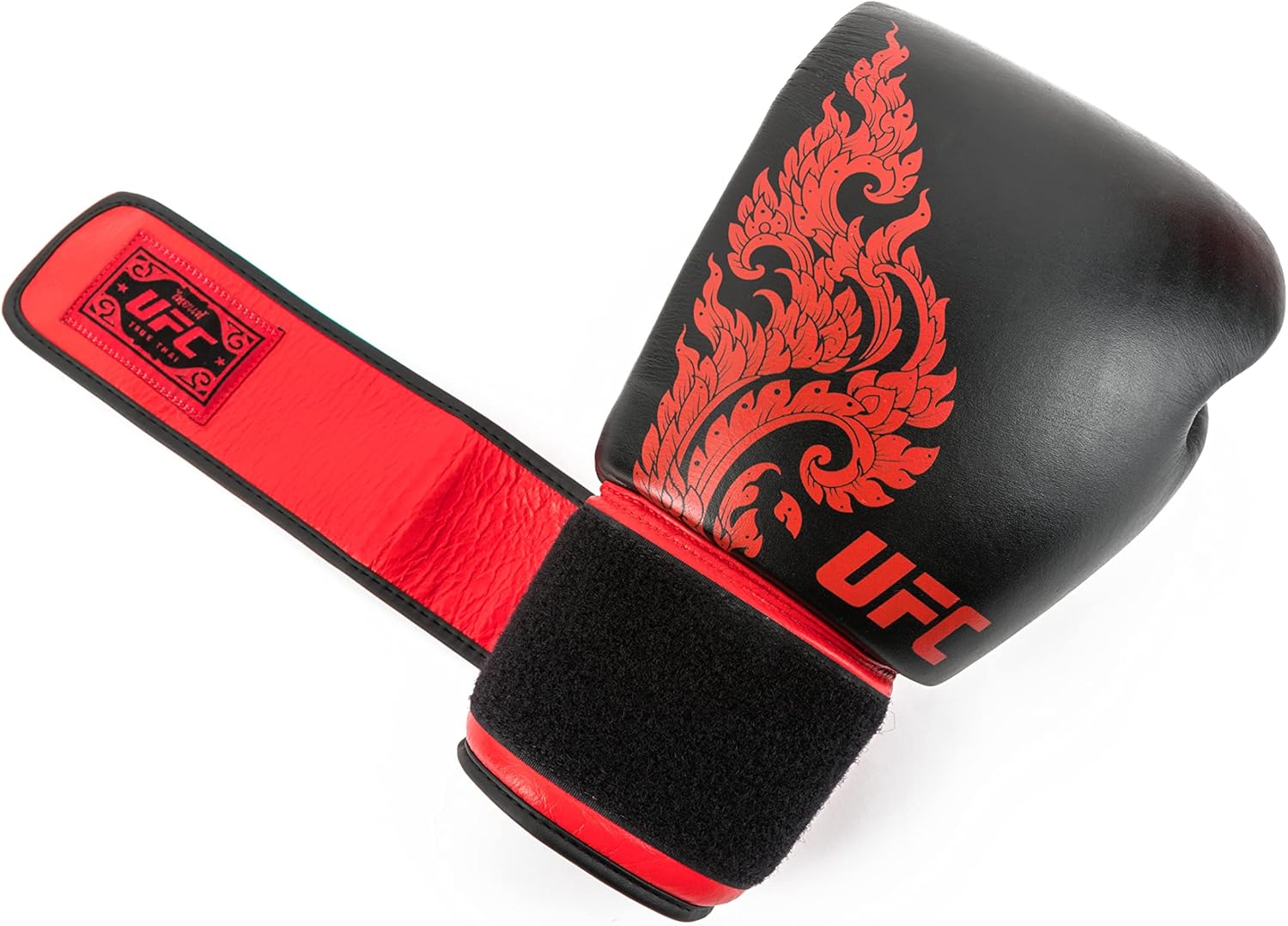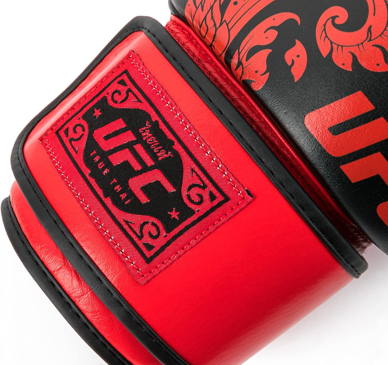 These Thai style training gloves are made for MMA. Their construction and design make it easy to open your hands, grab opponents and block kicks. They provide fighters of any skill level with excellent advantages: Thick padding: True Thai gloves keep your hands, thumbs and knuckles protected. They feature over an inch and a half of premium, layered and flexible foam rubber over the entire striking surface. Leather construction: These are Grade-A leather Muay Thai gloves. Training gloves made from genuine leather are easy to keep clean. These gloves set the standard for quality, comfort, odor control and durability. Moisture control: The glove design includes a perforated palm, letting your hands breathe and helping you stay cool. Wrist protection: UFC True Thai gloves are designed for fighters who want to train and fight hard. Gloves feature a rigid and adjustable leather wrist strap that secures using a hook and loop closure.