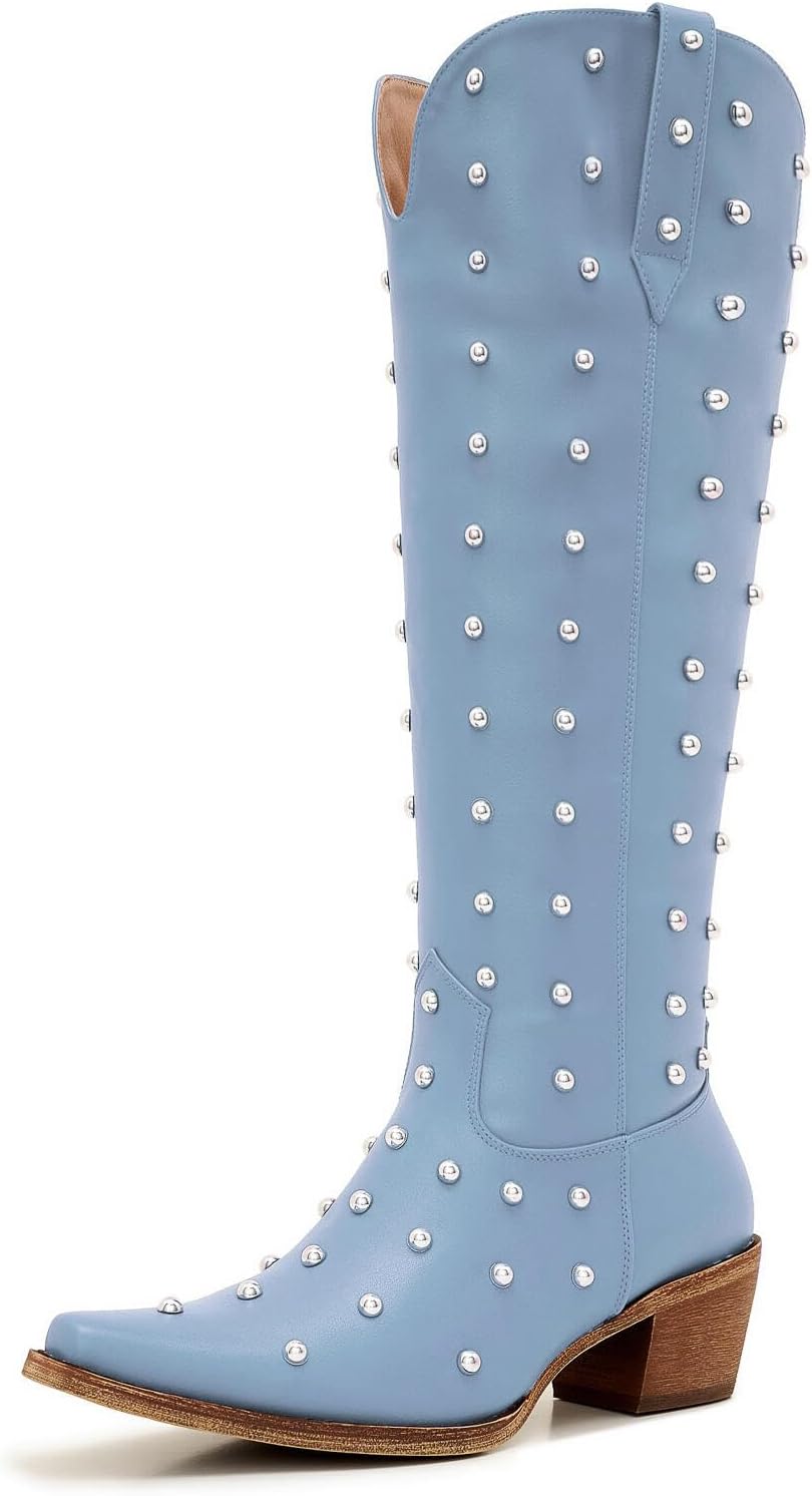 Step into bold Western style and unbeatable comfort with these Wide Calf Knee High Boots for Women. Designed especially for those who need extra room around the calves, these boots combine practical fit with striking fashion details. Featuring glossy metallic studs arranged across high-quality vegan leather, they bring a luxurious edge to the classic cowgirl silhouette. A comfortable block heel makes them ideal for day-to-night wear, while the knee-high cut offers warmth and style during the colder seasons. Whether you're heading to a country concert or dressing up for brunch, these boots promise confidence, comfort, and standout style.
