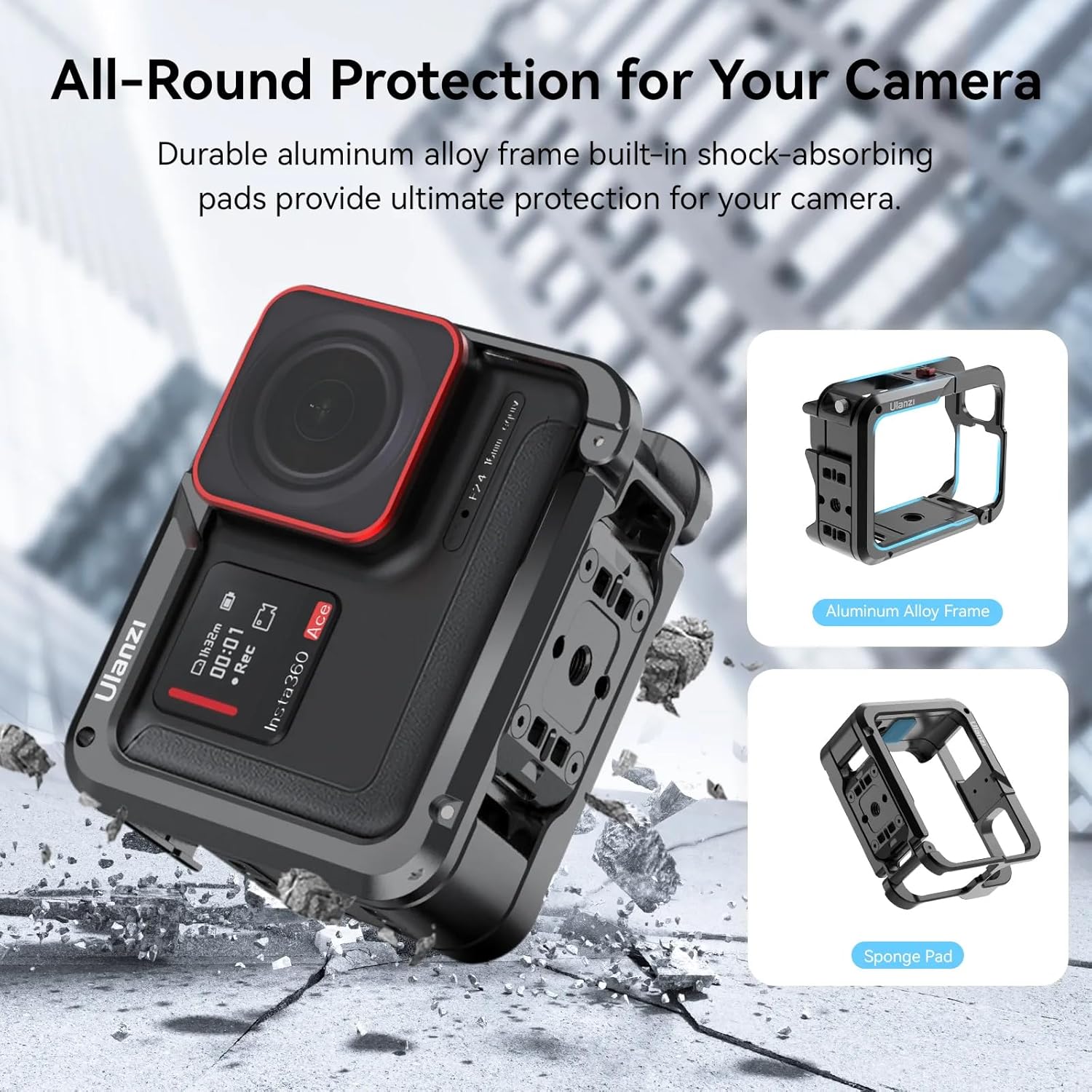 The Ulanzi Metal Cage for Insta360 Ace / Ace Pro C012 provides sturdy and adaptable support for your camera, ensuring you capture every moment. Seamlessly switch between vertical and horizontal modes, accommodating various accessories with interfaces like cold shoe mount, action mount, Ace mount, and 1/4" Arri locating pin.