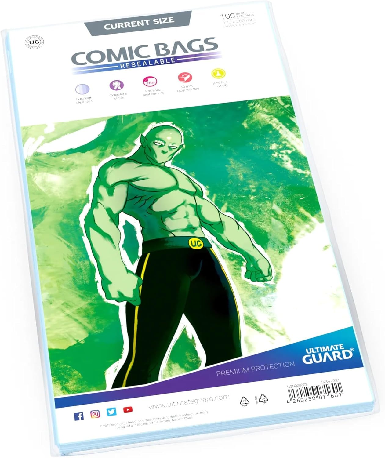 High quality resealable polypropylene bags for the protection and archival safe storage of Current comics. Bag size 175 x 268 mm (approx. 6 7/8 x 10 1/2 Inch), 100 bags per pack.