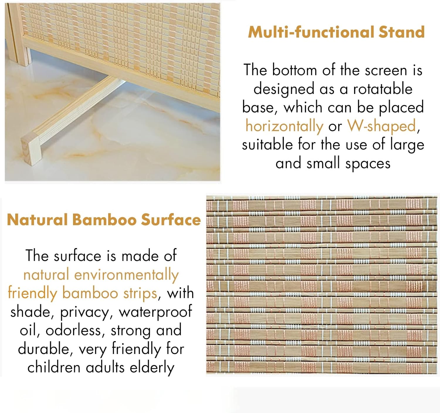 The Room Provider Privacy Screen is the ideal solution for creating your own personal space in any environment. Whether you need to set up a temporary dressing area, create a peaceful work nook in your home office, or establish privacy in a salon or dorm, this versatile room divider is designed to meet your needs. When privacy is no longer required, it can be easily reconfigured or moved to suit your space.Key Features:Durable Construction: Made from high-quality bamboo and solid wood, this privacy screen is both safe and sturdy, ensuring long-lasting use.Reliable Hinges: The stainless steel hinges are tested for up to 3000 open-and-close cycles without any damage, providing you with peace of mind.No Assembly Required: The screen comes ready to use right out of the box, allowing you to set up your space instantly.Portable Design: Lightweight and free-standing, this screen can be easily moved and stored, making it perfect for various settings like RVs, home offices, or restaurants.Stylish and Versatile: The elegant Chinese style design complements any decor, enhancing the aesthetic of your space.Functional Protection: This screen offers sunshade, waterproof, oil-proof, and UV protection, making it suitable for both indoor and outdoor use.Customizable Options: We offer adjustable height and width options to fit your specific requirements. Feel free to contact us for customization.Specifications:Material: Solid wood frame and bamboo rattanHeight Options: 120cm (47in), 130cm (51in), 140cm (55in), 150cm (59in), 160cm (63in), 170cm (67in), 180cm (71in)Width: 50cm (19.6in)Panel Options: Choose from 3, 4, 5, or 6 panels based on your needs.Included: 1 room divider (quantity based on your order), complete with installation accessories and base.Note: Please be aware that the color may vary slightly from...