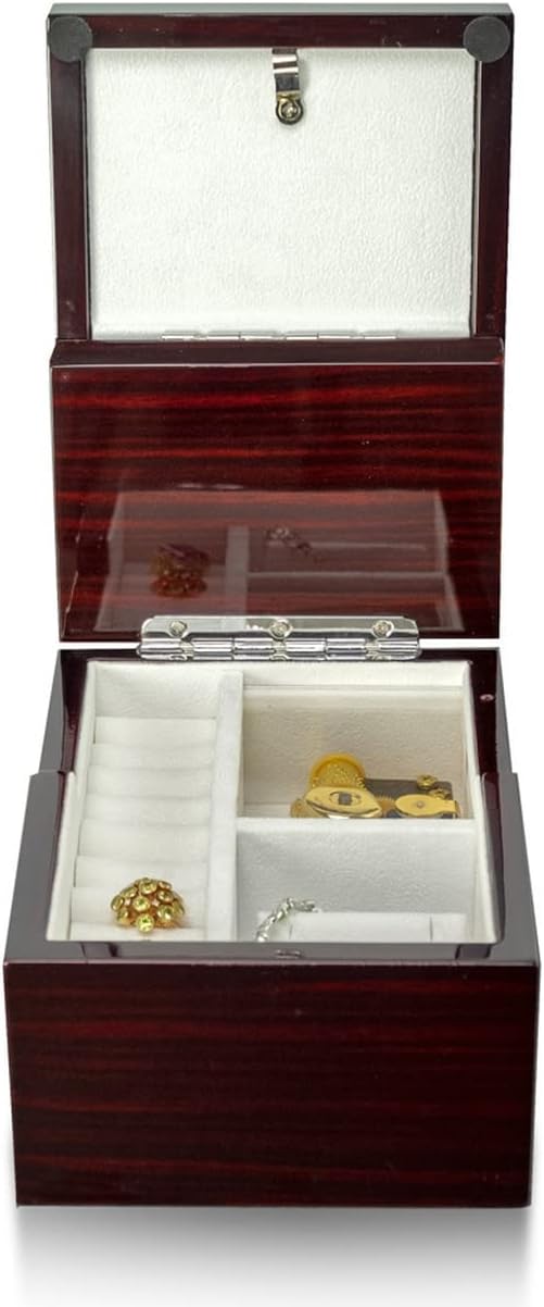 Ultra-Modern Music Box with 454 Song ChoicesLet your beloved cherish her lovely moments with this beautiful musical gifts jewelry box. This jewelry box for the gift by Music Box Attic not only stores your jewelry but also displays your favorite memory with a fold-up photo frame lid that sits flush when closed.The lid fits a 6" x 4" photo, you can fold up the lid to open the jewelry box and display the picture. This Musical box for women is designed artistically with smooth rounded corners with a beautiful hi-gloss rosewood finish. The interior is lined with white velvet that helps your valuables to stay safe. It has 1 open compartment and vertical ring rolls to help you organise your rings effortlessly. With a cutting edge 18-note movement inside this photo frame for decoration, you can enjoy your music box with your favorite melody. Personalize the unique custom gift for her by selecting the song she would love to hear time and again, from 454 available song titles. It’s a lovely home décor item the dressing table, chest of drawers and side table as well. Music Box Attic is the music box experts. With 30 years of experience in creating superior musical gifts, we bring you a tremendous variety of music gifts from around the world including mechanical, digital and newest cutting edge box styles, as well as traditional designs. Key Features of the Musical Jewelry Box With Photo Frame :Size of the Picture Frame: 6" x 4"Dimensions: Length - 6.8"; Width - 4.8"; Height – 3Interior: White velvet throughout, 1 open compartment, vertical ring rollBeautiful hi-gloss Rosewood finishPhoto frame sits flush when closedMaterial: Solid wood / Solid wood silver hardware & legMusical Device: 18-Note mechanical instrument365 Day Guarantee (return or exchange within a year) Lifetime Warranty after a year