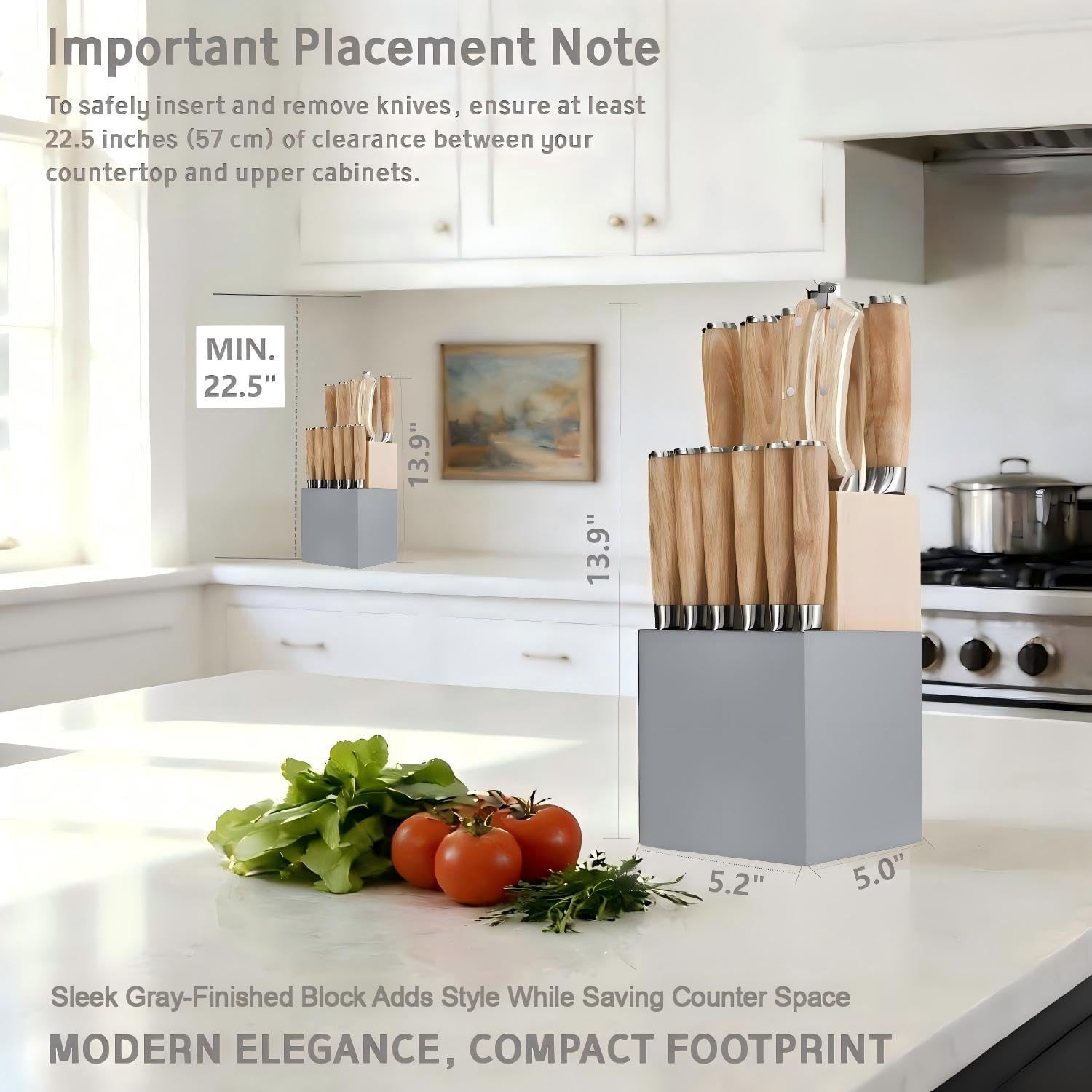 | Included Components | chef's knife (8"), bread knife (8"), slicing knife (8"), santoku knife (7"), utility knife (5"), paring knife (3.5"), serrated steak knife (4.5", 6pcs), kitchen shears, solid wood block |