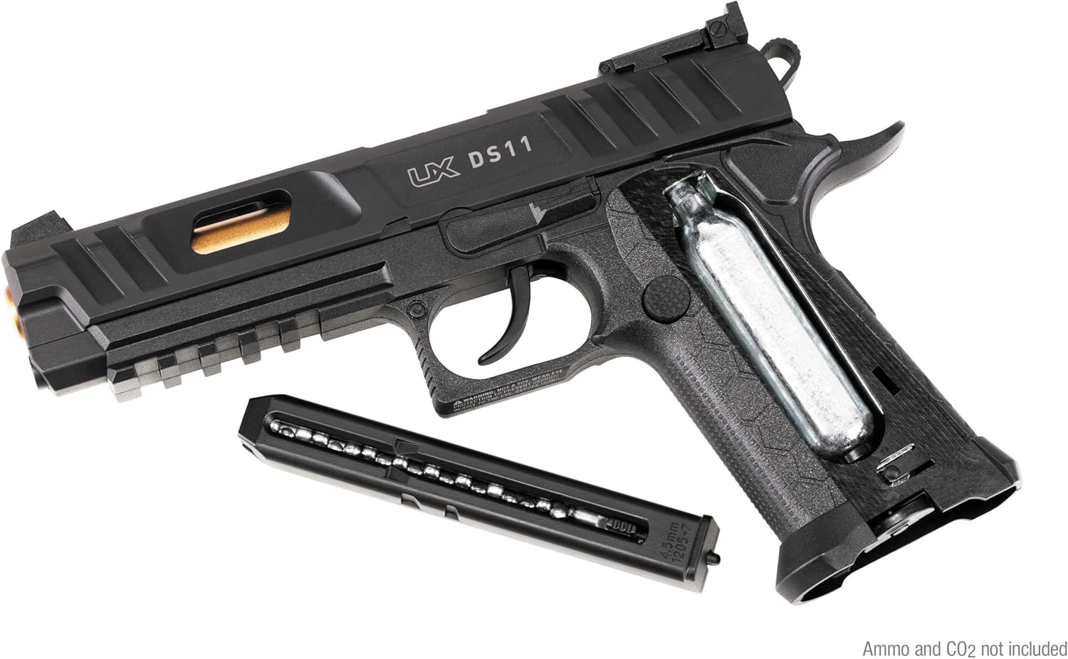 Double the fun with the new Umarex DS11 .177 caliber BB pistol. The 2011 is double-stack 1911 style pistol with a modern design twist as the manufacturer sees fit. With the Umarex DS11, we give you the big grip feel of the 2011 design with an agressively cut slide with dualcut-away windows, picatinny rail, and high-set sights. The Umarex DS11 launches .177 caliber BBs at 400 FPS and the stick magazine holds 18 BBs. Pick up a few bottles of Umarex Precision BBs, plenty of 12 gram UX CO2, and a spare magazine for weekend after weekend of BB plinking fun!