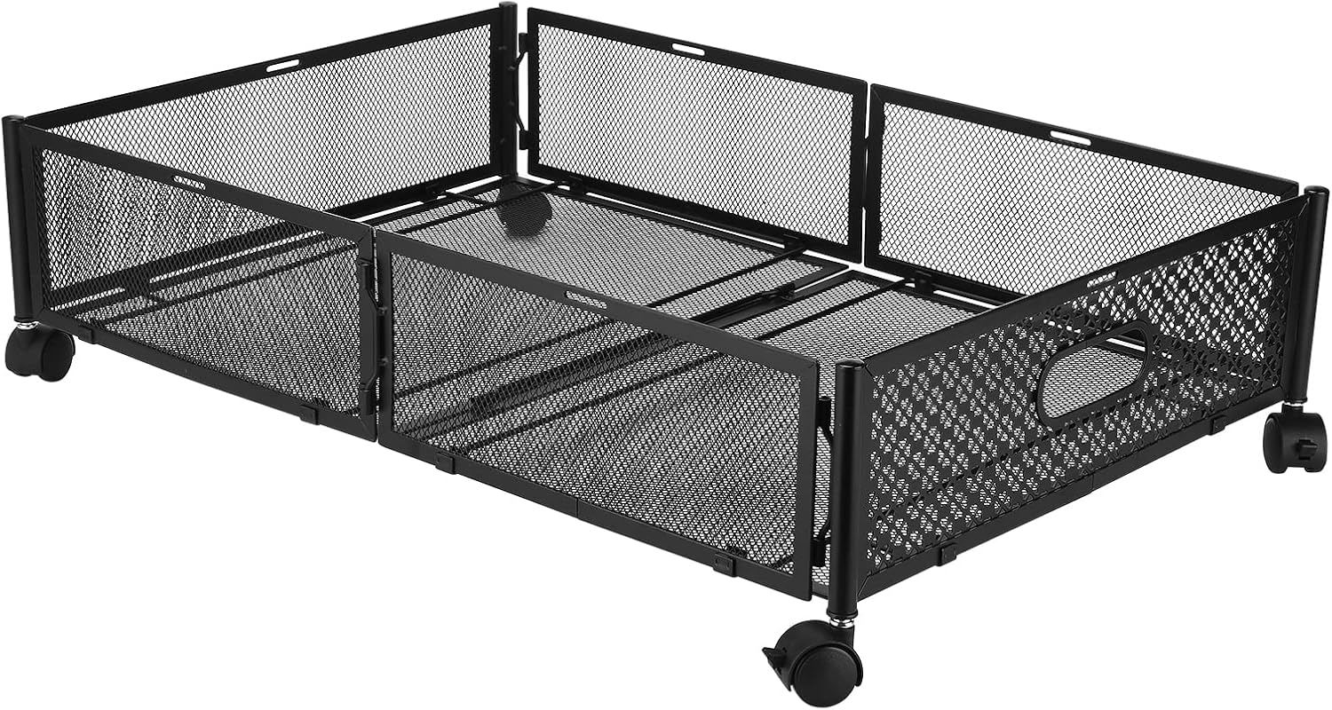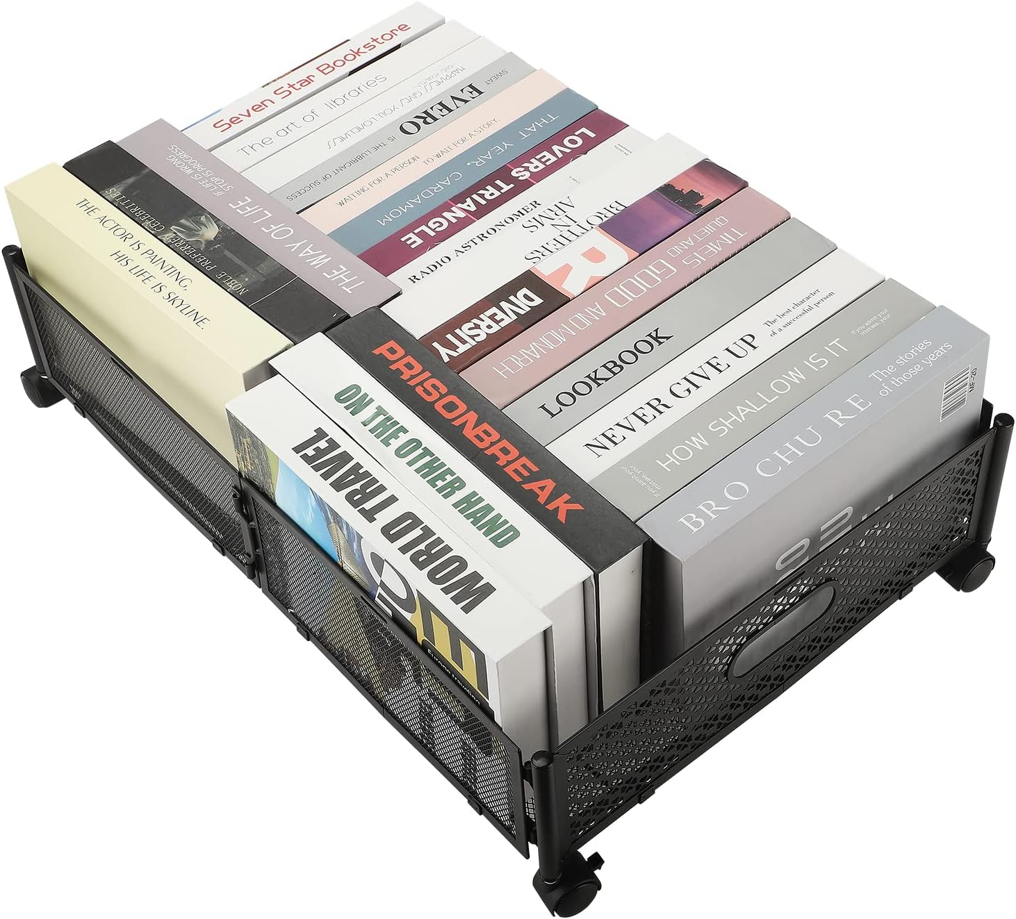 Feature:Specification:Features 1. Quality Metal Container: This under the bed storage container is completely made of metal compared with other under bed storage bins smaller net size of the shelf is used for a larger load-bearing capacity. 2. °Rotating Wheels: The added feature of wheels allows this under bed storager container to easily pull out for bedroom organization. Two of the 4 wheels can be locked by pushing the knob above it to fix the cart in position the elevated design shield stored items from and dirt and the carved floral pattern which makes you easily identify contents through the side frame even under the bed. 3. Tool-free & 1Minute Assembly Considering how complex assembly can be we simplified installation into just two simple steps. Just put the four wheels on the frame and then put the shelf onto it. The installation will be complete within one minute and no tools are required. 4. Foldable Design: As shown in the picture the underbed storage with wheels can be folded flat into ultra small size when not in use. Unfolded size 23.6 x 15.7 x 6.1 inch. 5. Wide Application: It's for seasonal under bed clothes storage under bed shoe storage bedding storage and more. Due to the rolling design it can also be used as under bed drawers on wheels. Specification Material: steel Color: Black Size: 60 x 40 x 15.5 cm Weight: 2000 g 4000 g Package Include: 1x Under Bed Storage or 2x Under Bed StoragePackage List:Package Include: 1x Under Bed Storage
