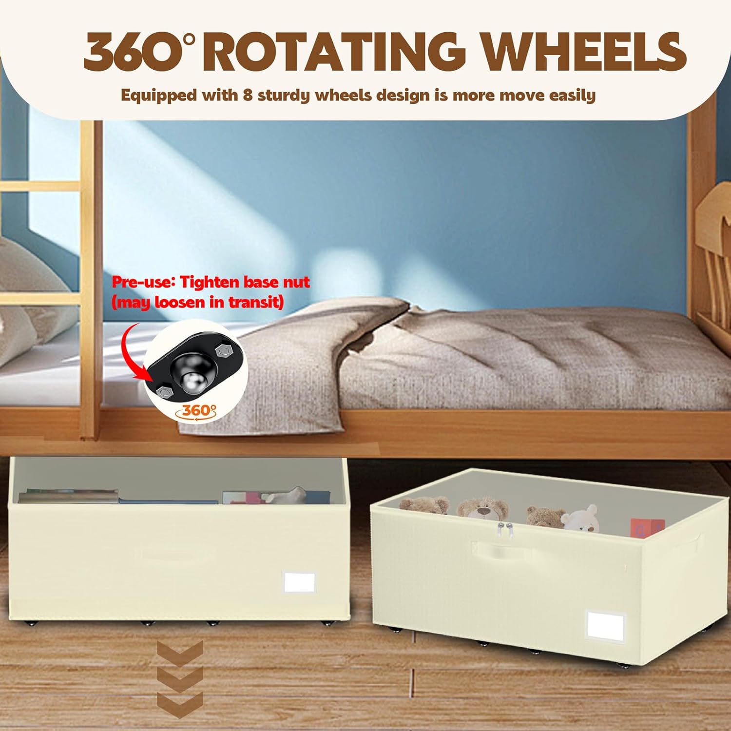 • 【Smoother Roller for 360° Mobility】Our underbed storage bins feature 8 smooth-rolling ball bearing wheels, so they glide effortlessly on any surface—even thick carpet! They work especially well on hardwood and tile floors, making it a breeze to access your stored items in seconds. No more struggling with stubborn bins—just pull and go!