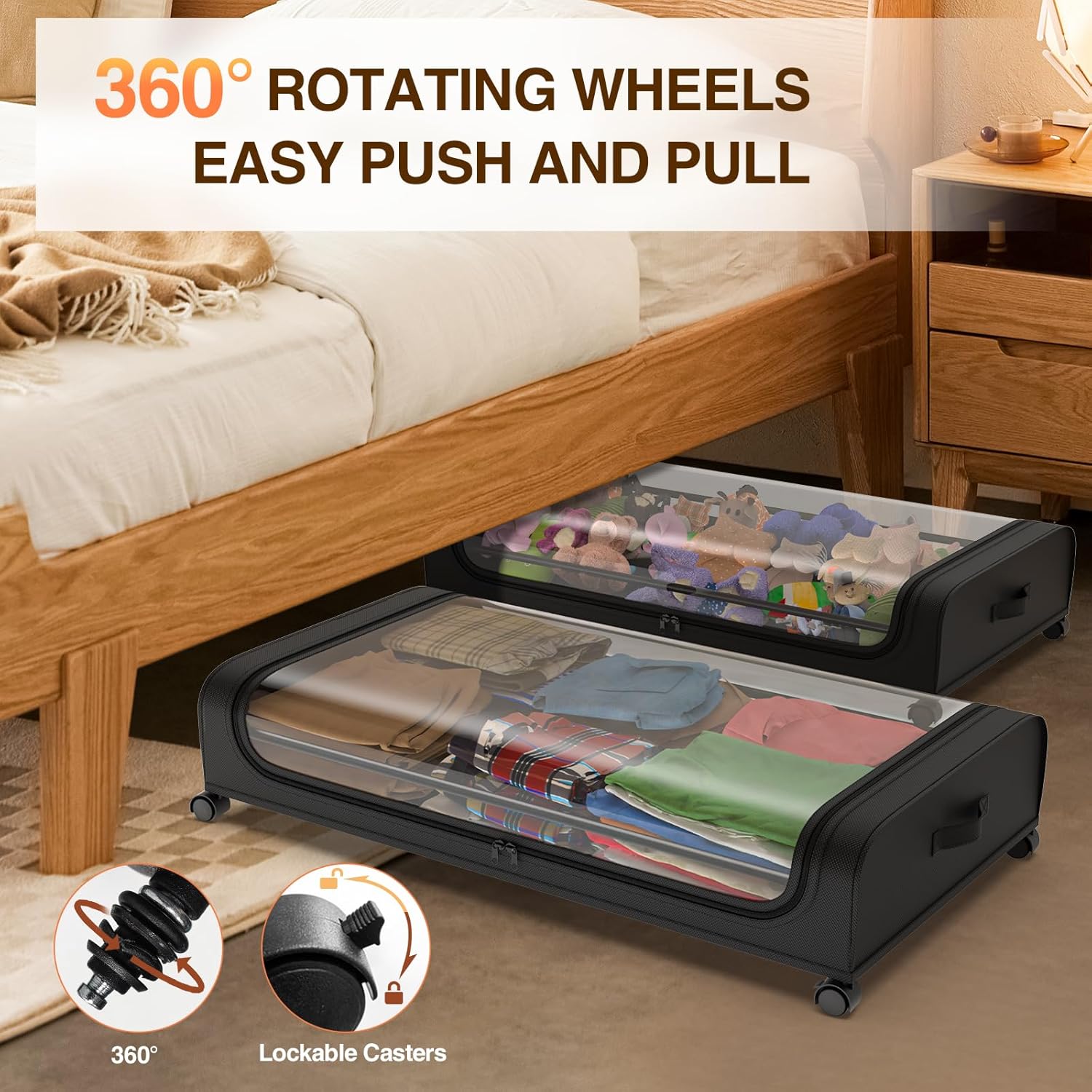 Under-bed storage solutions are an organized home's best friend. The lack of storage space makes it easy for clothes, linens and clutter to pile up because they have nowhere to go.DESCRIPTION:Material: Carbon steel & 600D Oxford ClothColor: BlackSize: 31.2'' L x 17.2'' W x 6.3'' HCapacity: 45L/PackPackage includes:2 x Under bed shoe storage1 x Assembly toolsNotes:Manual measurement, please allow slight errors on size.The color may exist a slight difference due to different screen displays.Under bed organizer, Easy to assemble !!!Assemble the anti-rust metal frame first, then fix the storage box to the frameThe underbed storage is collapsible with a soft cover and removable bottom board, fold it to save space when not in use.Dorm under bed storageThe back-to-school season is coming, living in a dorm or apartment, learning how to use limited storage space properly is important. The storage under bed bag is a great choice to keep your dorm organized and tidy.Under Bed Storage Drawers Made of Metal. the Load-bearing Iron Wire Structure is Added to Give the Entire Storage Box a Greater Load-bearing Capacity, with a Load-bearing Capacity of Up to 42 PoundsThe Included Four 360ยฐ Swivel Wheels Make It Easy to Move This Under-bed Storage Container. the 4 Wheels Can Be Fixed by Pushing the Switch Above. This is Very Helpful when the Storage Container Needs to Be Moved Frequently to Remove the Contents.