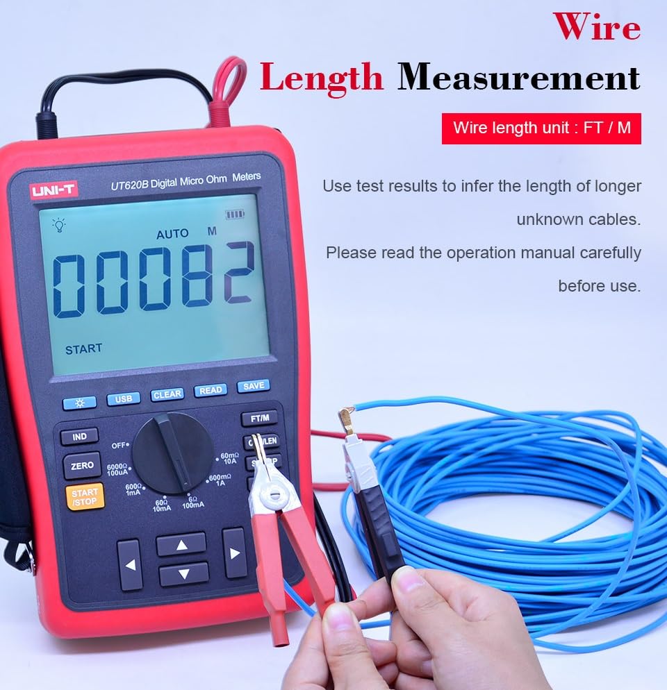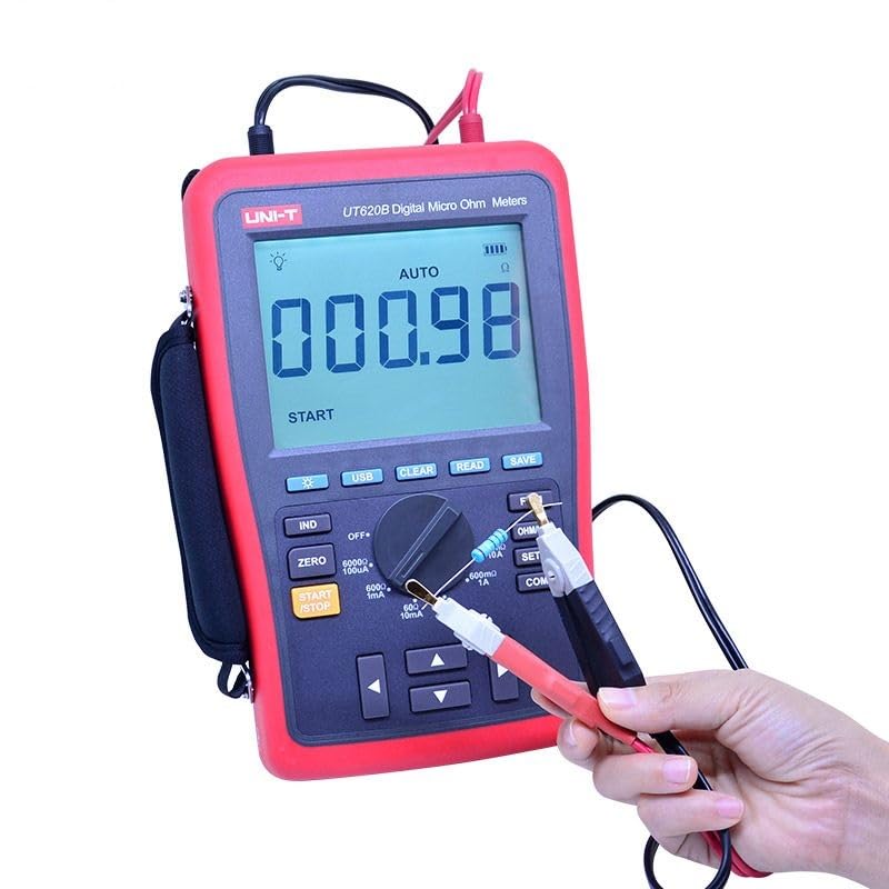 UT620B Digital Micro Ohm Meter UT620B Digital Micro Ohm Meter are used to measure DC low resistance through 4-wire method. Some of their features are: Comparison function to determine if the device is in good condition, unknown wire length calculation (FT/M); two-way data transmission by USB interface; built-in rechargeable lithium battery. UT620 can be used in narrow space for on-site troubleshooting, such as metal coating resistance/motor and small transformer winding resistance measurements, earth system joints/welding points/power distribution cabinet bus and lead connection inspections and more. Features: 1. Improved measurement method which improves accuracy by counter-balancing contact resistance of leads 2. Comparison measurement with upper and lower limits 3. Wire length measurement (m/ft) 4. Built-in Lithium battery 5. 1000-group data storage 6. Data transmission between USB and PC 7. Data hold 8. LCD backlight 9. Zeroing function, relative mode 10. IND resistance measurement mode