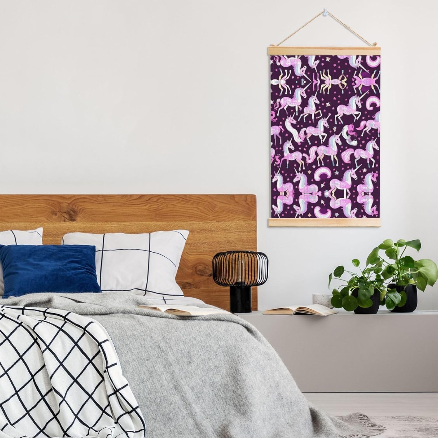Our Unicorns Pink Print Wooden Poster Hanger Is An Excellent Addition To Your Home Decor Or A Perfect Gift For Friends And Family. Made Of Selected Quality Canvas With Brilliant And Enduring Colors, This Wall Art Is Designed To Resist Water, Dust, And Fading, Ensuring The Bright And Vibrant Art Lasts. The Polyester Is Enclosed Between Two Teak Wood Hanger Scrolls With An Attached 35cm Rope For Easy Hanging. Installation Is Made Simple With The Included Two Nails In A Plastic Box. The Modern Minimalist Style Of Our Wall Hanging Complements Any Home Decor, Elevating The Artistic Ambiance And Brightening Up The Room. Experience The Elegant Transformation This Wall Hanging Scroll Painting Brings To Your Spaces Today.