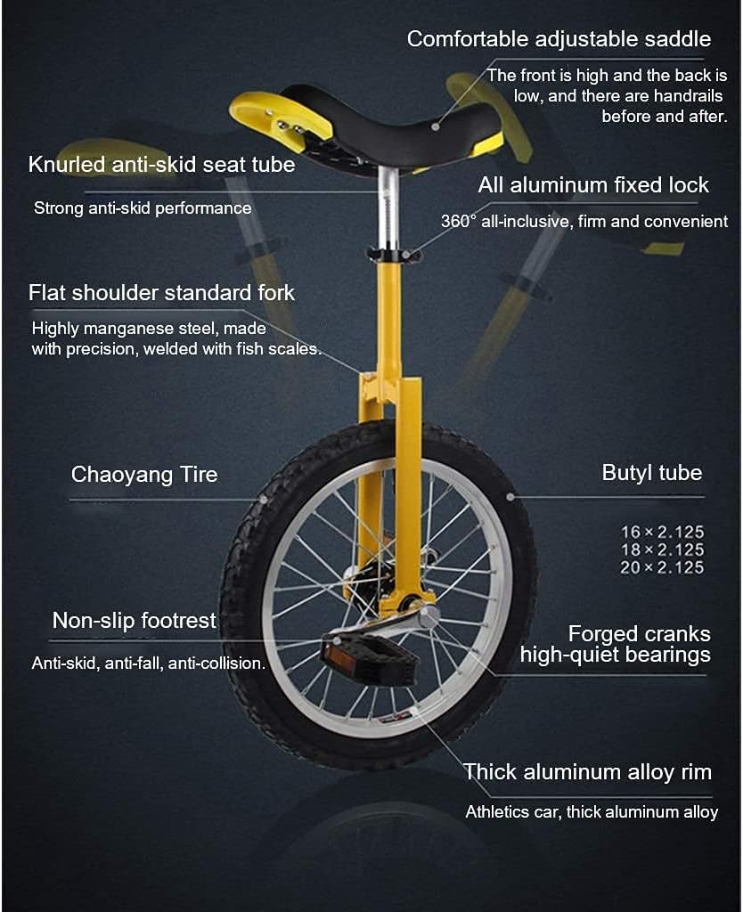 Unicycle sports is a sporting emerging event that combines sports, entertainment, and fitness. Adults, teenagers, beginners, and students generally love to ride unicycles. Unicycle sports as an entertainment project with both fun and entertainment fitness ?Specifications: Product Name: Unicycle Material: High-strength manganese steel frame Color classification: Red,Yellow,White blue Applicable : Adult/Child Tire size:20 inch , 24 inch Special recommendations: 1.7m-1.8m recommended to buy 20 inch 1.8 meters: 24 inch above The package includes: 1×Unicycle prompt: 1. During the shooting process, the actual color of the image may be slightly different from the product due to factors such as light, camera, and display settings. Check the actual color. 2. Dimension error: Different measurement methods may produce 1-2 CM Error between