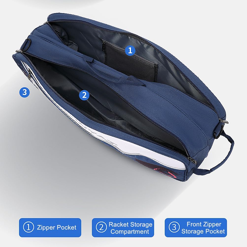 UNISTRENGH 3 Racquets Tennis-Bag Premium Tennis-Racket-Bag with Protective Pad 6 Racquets Badminton Bag for All Ages, Professional or Beginner Tennis PlayersItem Specification:Material: Premium quality Canvas with waterproof coatingInner liner: 210D polyesterDimensions: 29.13"L x 11.81"H x 8.27"W /74*30*21cmColor: Navy Blue, Red, Black, Lake BlueCapacity: 3 Racquet for tennis or 6 Racquets for BadmintonItem Feature:MULTI-BAG DESIGN FOR INCREASED CAPACITYLarge-capacity multi-functional auxiliary bag design, configuration of dual main pockets, secondary bag, independent shoe compartment, powerful taking into account the beauty of the racket bag.It can accommodate 6 badminton racquets and a bucket of 12 badminton, jackets, balls, drinks, mobile phones ,T-shirt ,or 3 tennis racquets and other items.INDEPENDENT SHOES WAREHOUSEThe separating shoe pack compartment can better separate shoes from other items, and be more hygienicPressure-proof Canvas SOFT CASEIt can better protect the racket and items from being squeezed while making the racket bag more stylishWATERPROOF AND DIRT RESISTANTPolyester with pvc coating,It can be better water repellent and more resistant to dirt.ADJUSTABLE SHOULDER STRAPSRacket backpack with dual zippers, dual shoulder straps or handles -width padded shoulder strapGood ventilation effect, keeping items ventilationPackage Included:1 x Racquets BagTips:If the surface of the racket bag is dirty, you can wipe it with a damp towel. Only hand wash