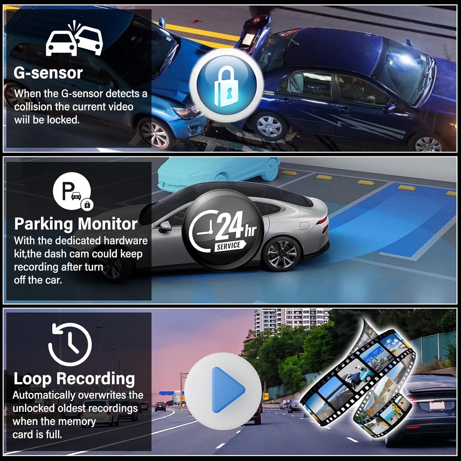 | Other Special Features of the Product | Loop Recording, Motion Detection and G-Sensor, Night Vision, Reverse Assist |
