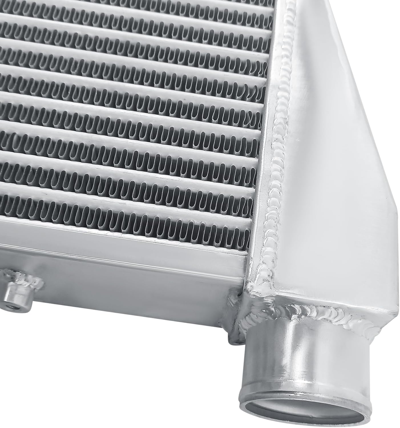Universal Intercooler 24''x11''x3.2" Top Mount Intercooler 2.5'' Inlet and Outlet Aluminum Turbo Intercooler Direct Replacement for Any Turbo Charger systemSpecificationsMaterial: AluminumColor: SilverType: IntercoolerConstruction: Machine Cut and Stamped, Hand WeldedWorking Pressure: 80+PSIInlet & Outlet Diameter: 2.5inCore Size: 18x9x2.8inOverall Size: 24x11x3.2inApplicable Models: Universal for Any Turbo Charger SystemFeature:The intercooler offers several benefits, including reducing fuel consumption, enhancing the car's adaptability to different altitudes, improving supercharger matching, extending engine life, and enhancing driving safety