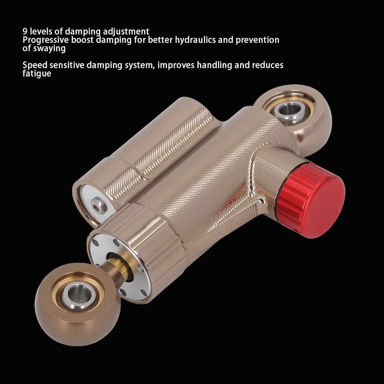 1. Enhanced Front Wheel Stability: The steering damper enhances the stability of the front wheel through its damping action. It effectively resists sudden large steering movements by man or external forces, while allowing small steering movement. 2. Improved Steering Safety: Steering damper prevents front end wobbling at high speeds, reduces vibrations from uneven roads, and enhances cornering stability for increased road safety. 3. Aluminum Alloy Material: Made of high strength 6061 aviation aluminum alloy, this steering damper has rugged structure, resist to wear, and provides stable performance and long lifespan. 4. Complete Damping System: Built in complete damping system and speed sensitive technology, this stabilizer helps maintain control, reduce fatigue, provide more responsive handling, and offer a more comfortable driving experience. 5. Easy Installation: Precision made steering damper can be easily installed without modification, suitable for all motorcycles, boosting your confidence in riding. Specification: Item Type: Motorcycle Steering Damper Material: 6061 Aviation Aluminum Alloy Color: Gold Length: Approx. 133mm / 5.24in Movement Life: 500,000 times Design: Directional Steering Damper, Enhances Stability Performance: High Grade, Wear resist, Speed Sensitive Damping System, Improves Handling and Reduces Fatigue Uses No Pollution Imported Damping Oil, Insensitive to Environmental Temperature, Can Work Normally in -40°C to +100°C Range Application: Universal Fit for All Motorcycles packing list: 1 x Steering Damper(5 Components ) Notice: 1. Check if the steering damper and its kit reach the motorcycle or tank. If not or if there is insufficient space, move the steering damper horizontally to a suitable position. 2. After installation, turn the head to the right and left to check if there is enough movement space for the steering damper.