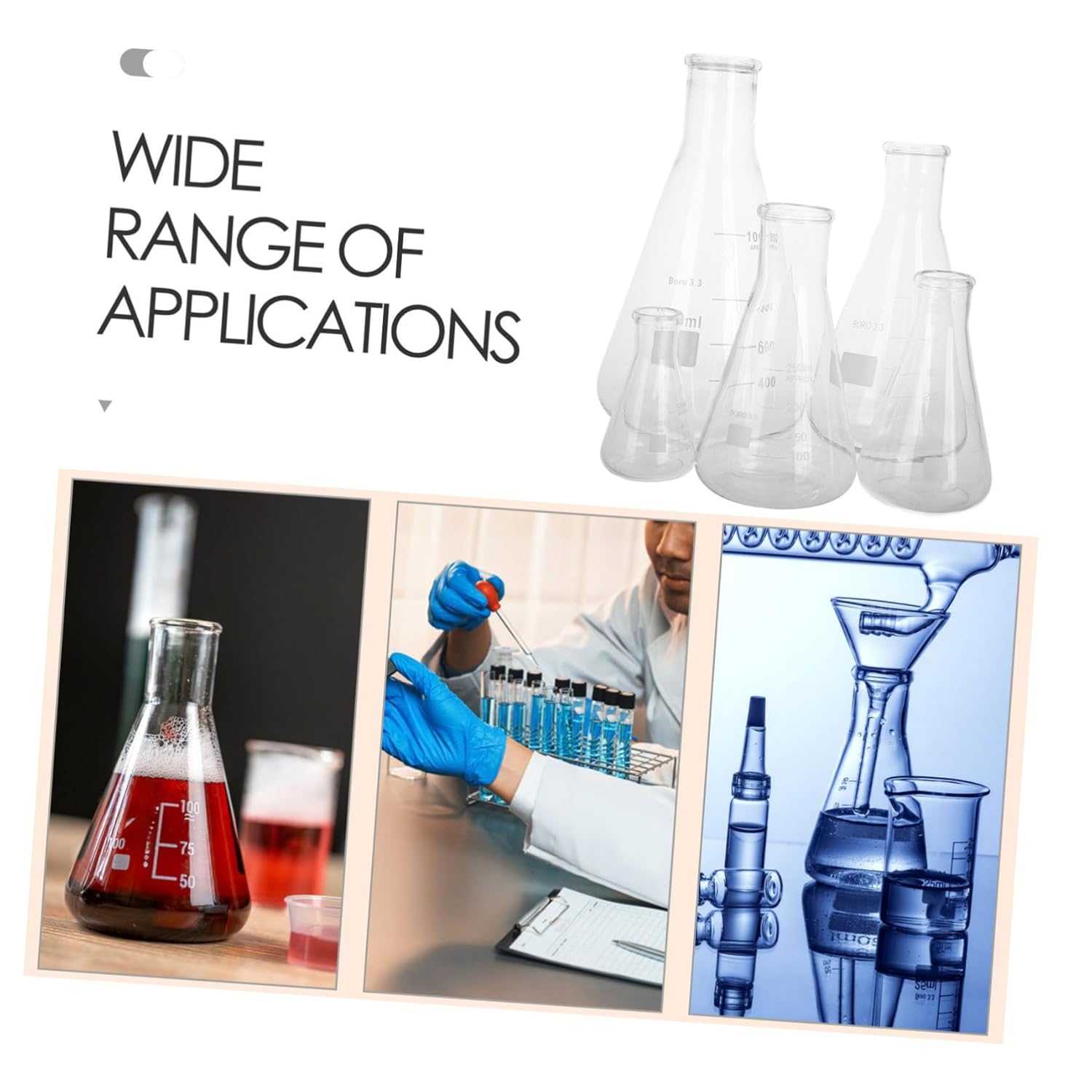 Package Include 5 Flasks ( 50ml+150ml+250ml+500ml+1L ) Characteristics -Size:18.00X10.50X10.50cm/7.07X4.13X4.13in lab beakers -Material:High borosilicate lab flask -Color:Multi borosilicate glass measuring cup -Versatile capacity: the flask's capacity is ideal for laboratory tasks, providing ample space for mixing and measuring liquids chemistry glassware. -Stable design: the triangular base ensures the flask remains stable on flat surfaces, minimizing the risk of accidents and enhancing lab safety erlenmeyer shape flasks. -Easy to maintain: the flask features a welldesigned mouth that allows for easy cleaning and filling, ensuring maintenance in the lab lab glass. -Ergonomic shape: the conical design of the flask facilitates easy and controlled pouring, reducing the chances of accidental spills and splashes science beaker. -Temperature : constructed from high borosilicate glass, this flask can withstand high temperatures, making it suitable for various lab applications lab equipment.Goods Descriptionlaboratory glass The flask's conical shape is Ideal for mixing and swirling , while the narrow neck minimizes the risk of spillage.lab erlenmeyer flasks This high borosilicate glass Erlenmeyer flask is a staple in any laboratory, known for its durability and thermal resistance.lab equipment It is suitable for use with various heating devices, making it an essential tool for experiments that require precise temperature control and handling