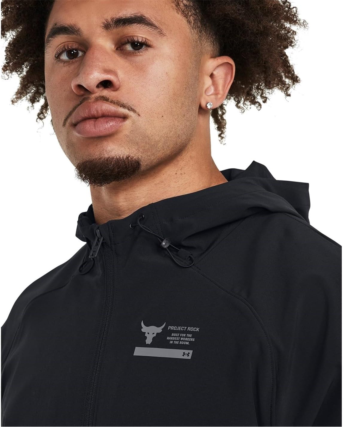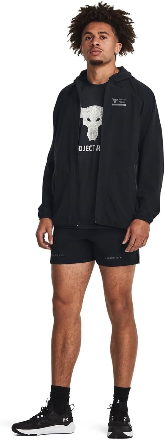 Push boundaries with Project Rock gear, personally approved by Dwayne 'The Rock' Johnson. This water-resistant, ventilated jacket offers 4-way stretch for full mobility. Its tough yet lightweight fabric and bungee-adjust hood ensure comfort and practicality. Side zips provide quick ventilation, while secure zip hand pockets and binding at cuffs and hem complete the design. Machine washable, tumble dry low.