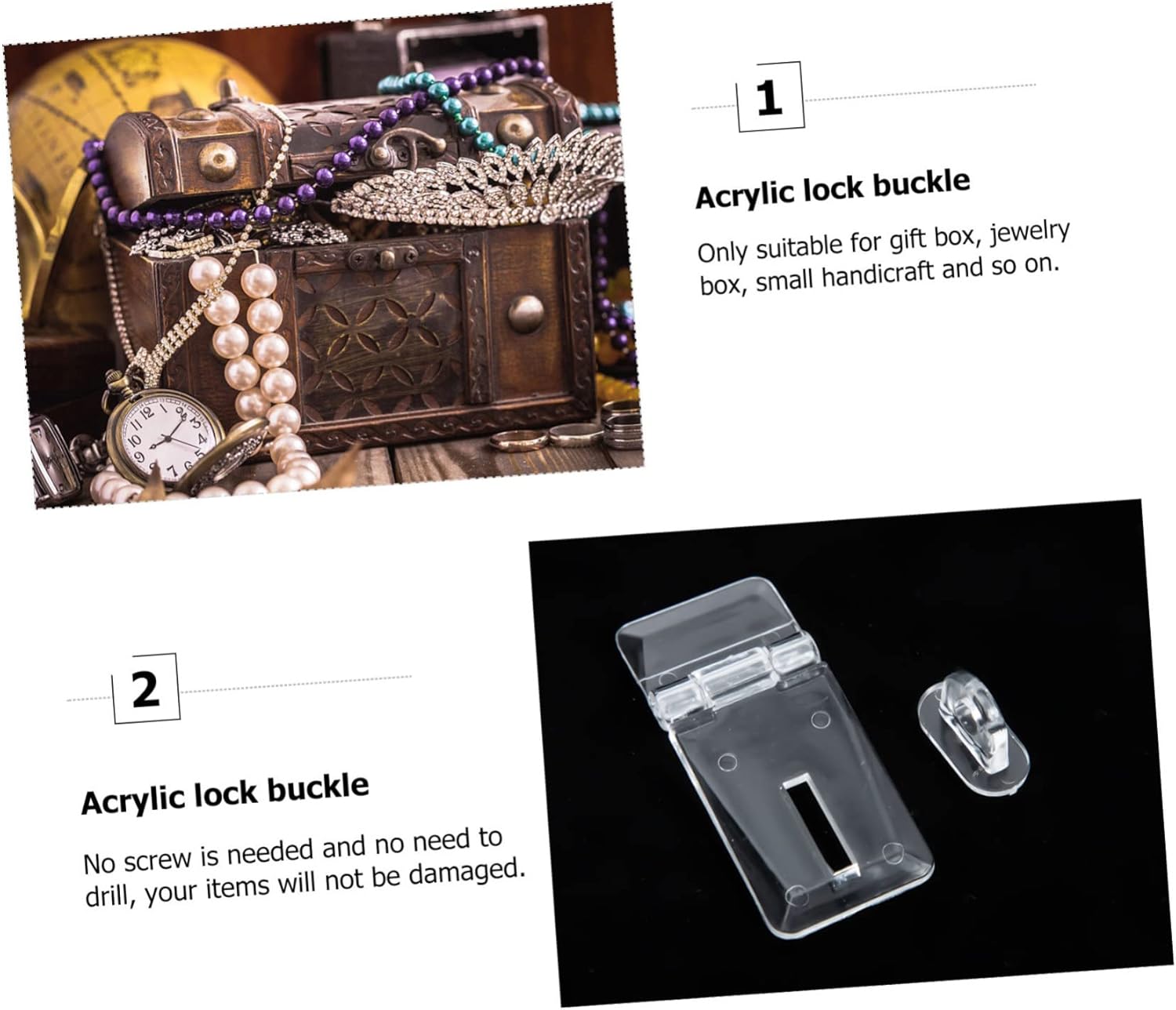Package Include 200 x Clear Acrylic Locks 200 x Clear Acrylic Buckles Features -Material: Acrylic Transparent Acrylic Lock Hasp. -Color: Transparent latch hasp lock. -Size: About 5.50X2.50X2.00cm/2.16X0.98X0 Plastic Lock Hasp. -With high hardness and ,easy to install and replace the old one acrylic hasp. -Designed with simple and stylish style,match well with many kinds of room doors hinge lock. - DIY woodworking cases, giftboxes, storage cases, bathroom door, pet cages, etc clear. -Equipped with large quantities for needs, or you can share with your friends cabinet lock hasp. -Adopted with mild and durable material, noteasy to deform and damage clear box hinge.Goods Descriptionlock hasp Come with many quantities for your needs,suitable for luggage case, suitcases, doors, etc.Acrylic Hinge Hasp Made of gentleand durable material, practical and sturdy, not easy to damage and wear, withhigh hardness and .lock for cabinet doors Are you looking for clear acrylic lock haspfor suitcase and room doors? Then you must not miss our product
