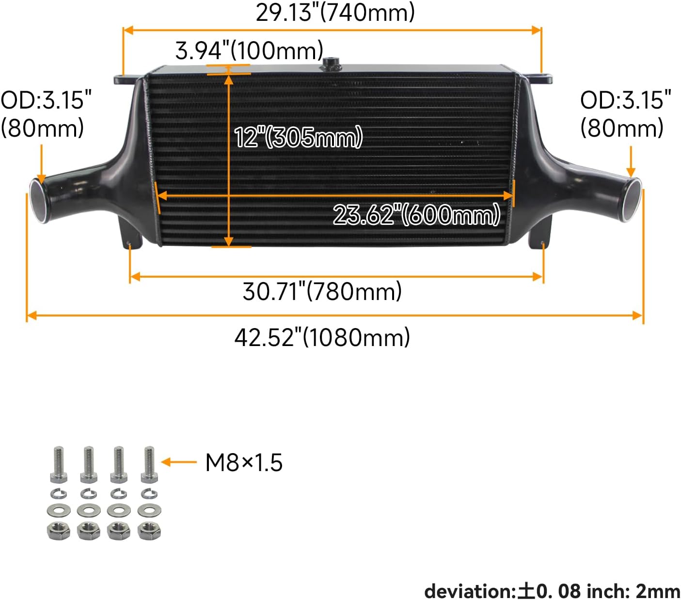 Title:FMIC Aluminum Front Mount Intercooler For Skyline R33 R34 GTR RB26DETTApplication: For Nissan Skyline R33 R34 GTR RB26DETTDetails:AVAILABLE FOR BOTH R33 GTR & R34 GTR.Intercooler with the inlet /outlet 80mm OD sizeProfessional installation is highly recommendedThe quality and fitment of this kit is similar to much more expensive fmic's on the market like Greddy, Blitz, HKS and even APS.In most cases this front mount intercooler is larger and more efficient than the rest.Key features and benefits:- Tabs on bottom and top for easy installation- Improved Tube and Fin to increase performance efficiency by 15% over the old bar and plate design- Ultra low intercooler pressure drop: 0.5-1psi at 23psi (normal bar and plate intercooler is 2.8- 4 psi at 23 psi)- 35% weight reduction compared to bar and plate type intercooler- Everything in the photo is includedNote:It's the upgrade model, so it not suit the stock pipes