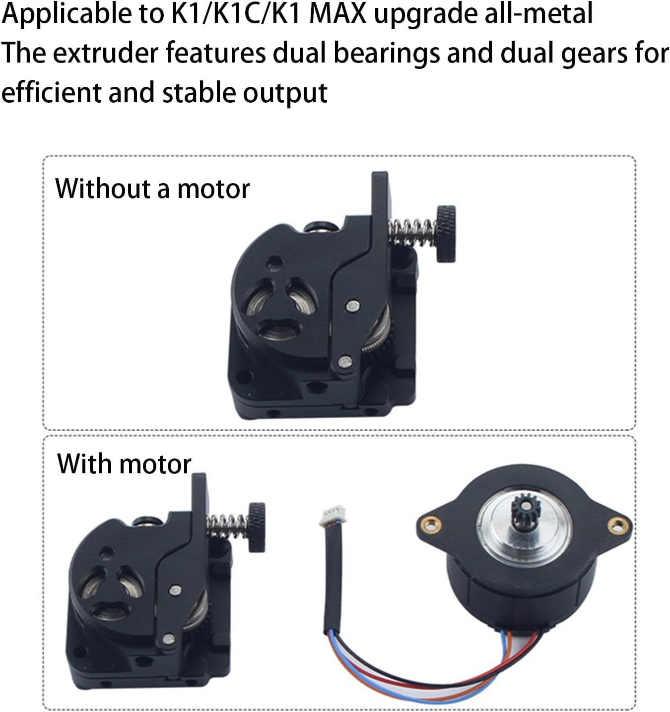 Upgraded Metal Extruder Compatibility with Multiple Filaments PETG ABS for K1C K1Max Printers Stable PrintingFeatures:Upgrades your printer with this durability metal extruder housing featuring precise engineered ABS+metal construction for enhances longevity and stable filaments feeding.double gear direct drive mechanism ensures smooth, highly speed extrusion without filaments damage while maintaining compatibility for PETG, ABS, and specialty filaments.Ideal for makers, engineers, and educators requiring reliability extrusion in demanding printing applications across workshops and prototyping lab.Perfect for extended printing, complex geometries, and high temp materials where consistent extrusion prevents clogs and layer inconsistencies.Easy installation preserves motor wiring simply replace the extrusion module via rear panel access without disassembling entire assemblies.Specifications:Component:ABS+MetalExtruder Size:Approx.50x38mm/1.97x1.5inchMotor Size:Approx.50.5x36mm/1.99x1.42inchOption Type:Extruder with Motor,Extruder without Motor,for K1C/K1Max Printer;Package Includes:1pc Metal ExtruderNote:Please allow 1-10mm errors due to manual measurement. Due to the differences between different monitors, the picture may not reflect the actual item color.