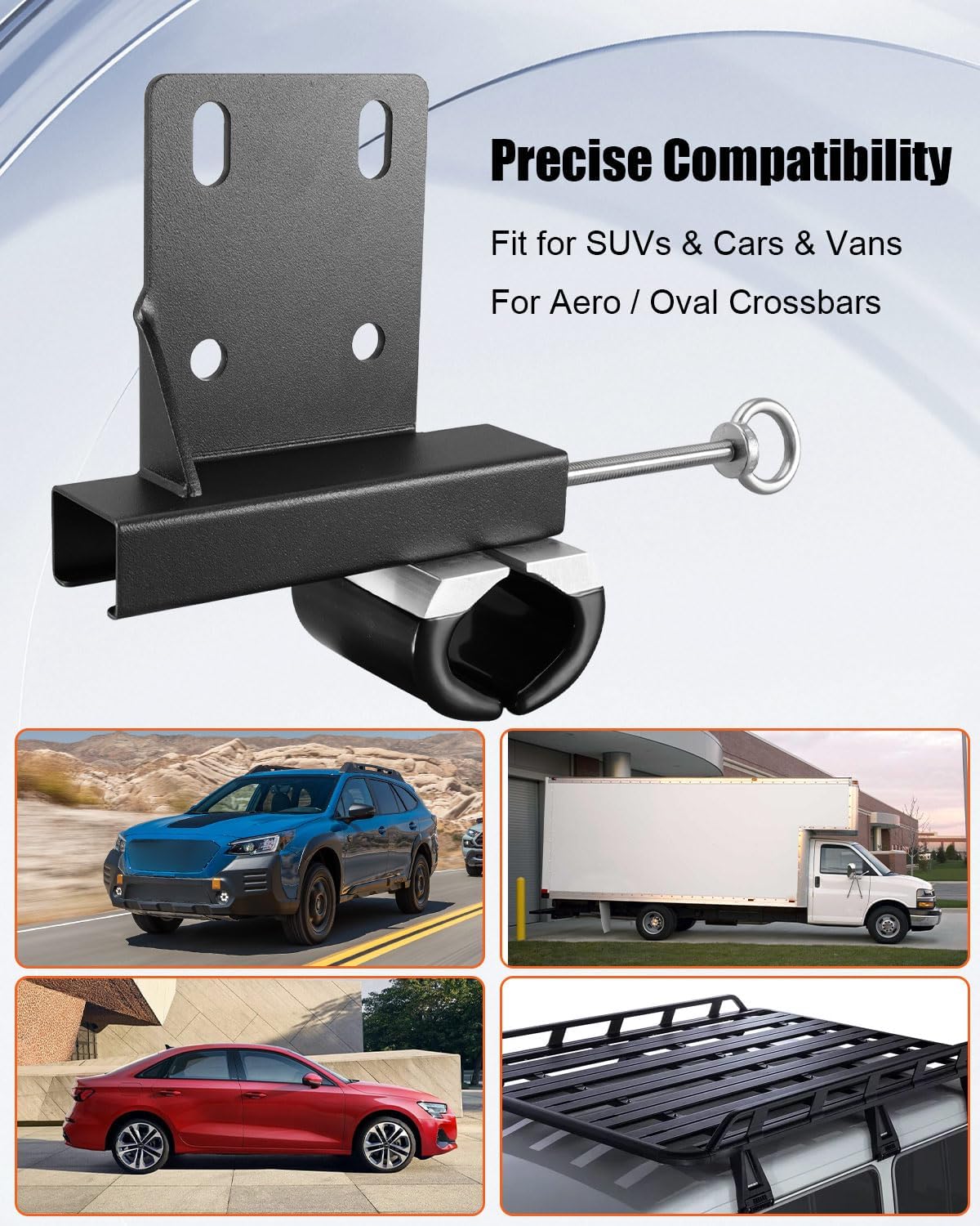 Compatible Models Fit for most SUVs, cars and vans equipped with Aero or Oval roof rack crossbars Fit for vehicles with factory or aftermarket roof racks using aero / oval crossbar profiles Not compatible with round crossbars Are You Experiencing These Roof Rack Installation Problems? No suitable mounting point for LED light bars or work lights Accessories shift or vibrate while driving Hesitant to drill into roof racks or vehicle body Advantages of our Universal Roof Rack Mounting Brackets: Designed to fit for most aero and oval roof rack crossbars Reinforced triangular gusset helps improve load stability Metal construction supports outdoor and road use Bolt-on, no-drill installation protects your crossbars Rubber pads help reduce movement and surface wear Package Includes: 2 × Universal Roof Rack Mounting Brackets