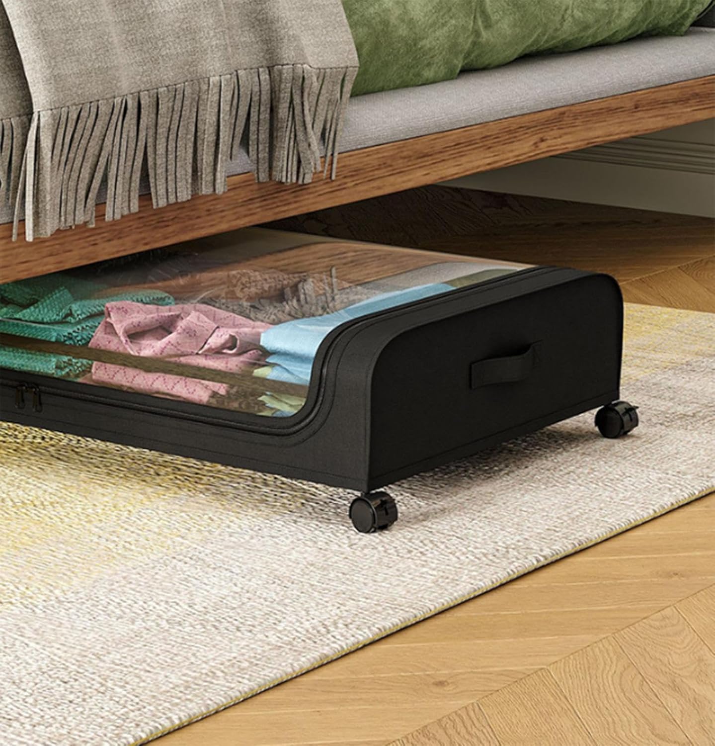Clean up your home with the under bed storage containers with wheels, keep your home in order, say good bye to stress and anxiety, embrace cozy life. Feature: 50L Capacity- More space to tuck away items. PVC Dustproof Lid- Quick to see what's inside. Rotatable Wheels- Easy to glide in and out effortlessly. Metal Container- Strong Load bearing to prevent falling apart. Dual Handles & Zippers- Easy to pull from both sides & access to add or remove items. Product size: 80*40*13cm/31.5*15.74*5.11in Product material: metal/non-woven fabric Product packaging includes: under-bed storage containers*1 Make your linen closet neat and organized with this bed sheet organizer, which can help you organize your closet efficiently and quickly. It is an essential tool in your life! Please note: The dimensions are all measured manually, there may be slight errors, which will not affect normal use.
