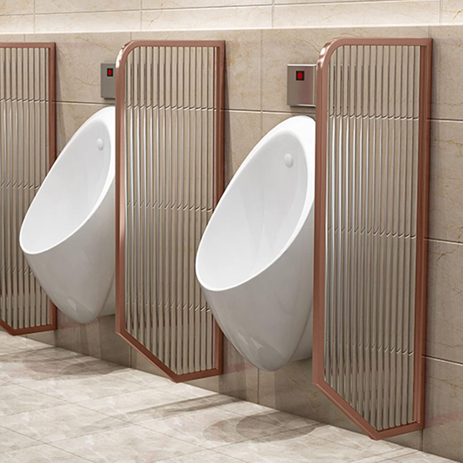 The creatively designed bathroom screen realizes the private separation of space. It is not only the decoration of space partition, but also the protection of privacy, and also represents the highlight of creating space. Name: Urinal Partition Material: stainless steel frame, tempered glass Surface treatment: high temperature baking paint Size: Height 120cm*Width 40cm Color: Black, Gold, Silver, Rose Gold Item: Urinal Partition Type: Urinal Screen Installation type: wall/ground Specifications: Partition *1,Partition *2 Including: installation hardware The privacy screen room divider is made of stainless steel frame and translucent tempered glass. It is not easy to deform, and the partition wall will be very stable. A 120cm high room divider wall will provide extra privacy to block some visual clutter and make the space more uncluttered. The elegant design can also help you decorate your room while creating privacy, it is the best partition for public toilets. The translucent glass partition is selected from high-quality frosted tempered glass, which is scratch-resistant and durable, and can expand your visual experience while protecting privacy without blocking light. The screen mounts quickly and easily to any hard wall, and the mounting bars ensure that there are no visible or exposed screws.