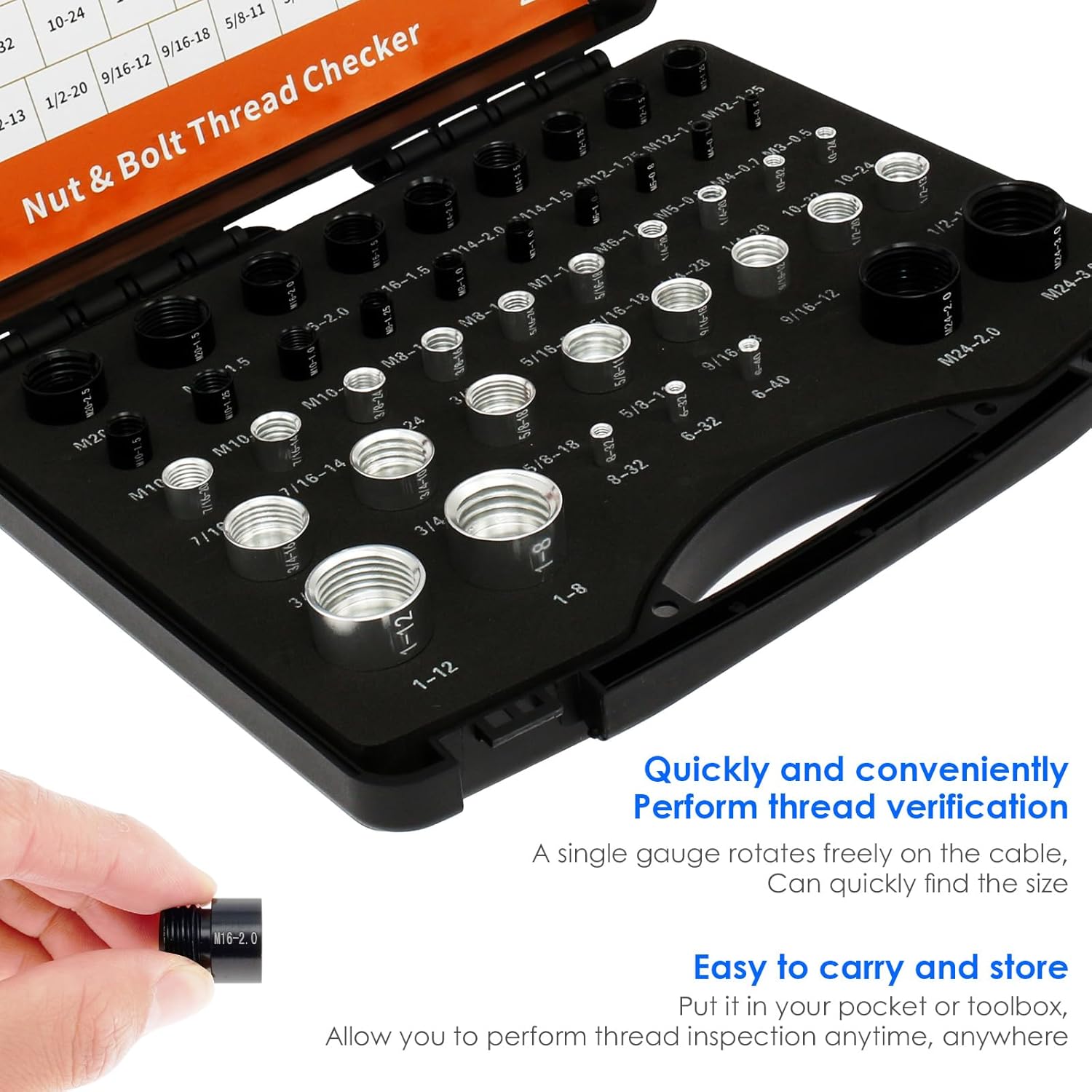 Parts List:44 × CheckerProduct Specification:Description:Accurately detects whether the threads of nuts and bolts match each other, ensures a strong connection after assembly, and guarantees the safety and stability of the structureKey Feature:The thread checker can rapidly inspect a large number of nuts and bolts, screening out products that meet standards, increasing production efficiency and reducing inspection timeSpecification:Texture: Aluminium44 Specifications:M3×0.5, M4×0.7, M5×0.8, M6×1.0, M7×1.0, M8×1.0, M8×1.25, M10×1.0, M10×1.25, M10×1.5, M12×1.25, M12×1.5, M12×1.75, M14×1.5, M14×2.0, M16×1.5, M16×2.0, M20×1.5, M20×2.5, M24×2.0, M24×3.0. INCHES: 6-32, 6-40, 8-32, 10-24, 10-32, 1/4-20, 1/4-28, 5/16-18, 5/16-24, 3/8-16, 3/8-24, 7/16-14, 7/16-20, 1/2-13, 1/2-20, 9/16-12, 9/16-18, 5/8-11, 5/8-18, 3/4-10, 3/4-16, 1-8, 1-12Notes:1.There may be slight differences between the picture and the actual color of the commodity. We will try our best to show you the exact color.2.Please allow slight dimension difference due to manual measurement.