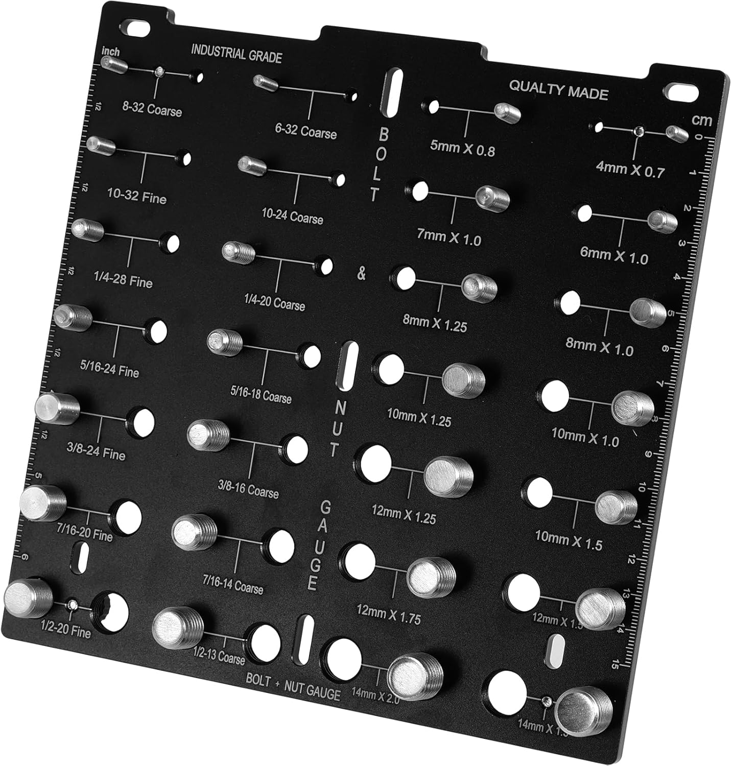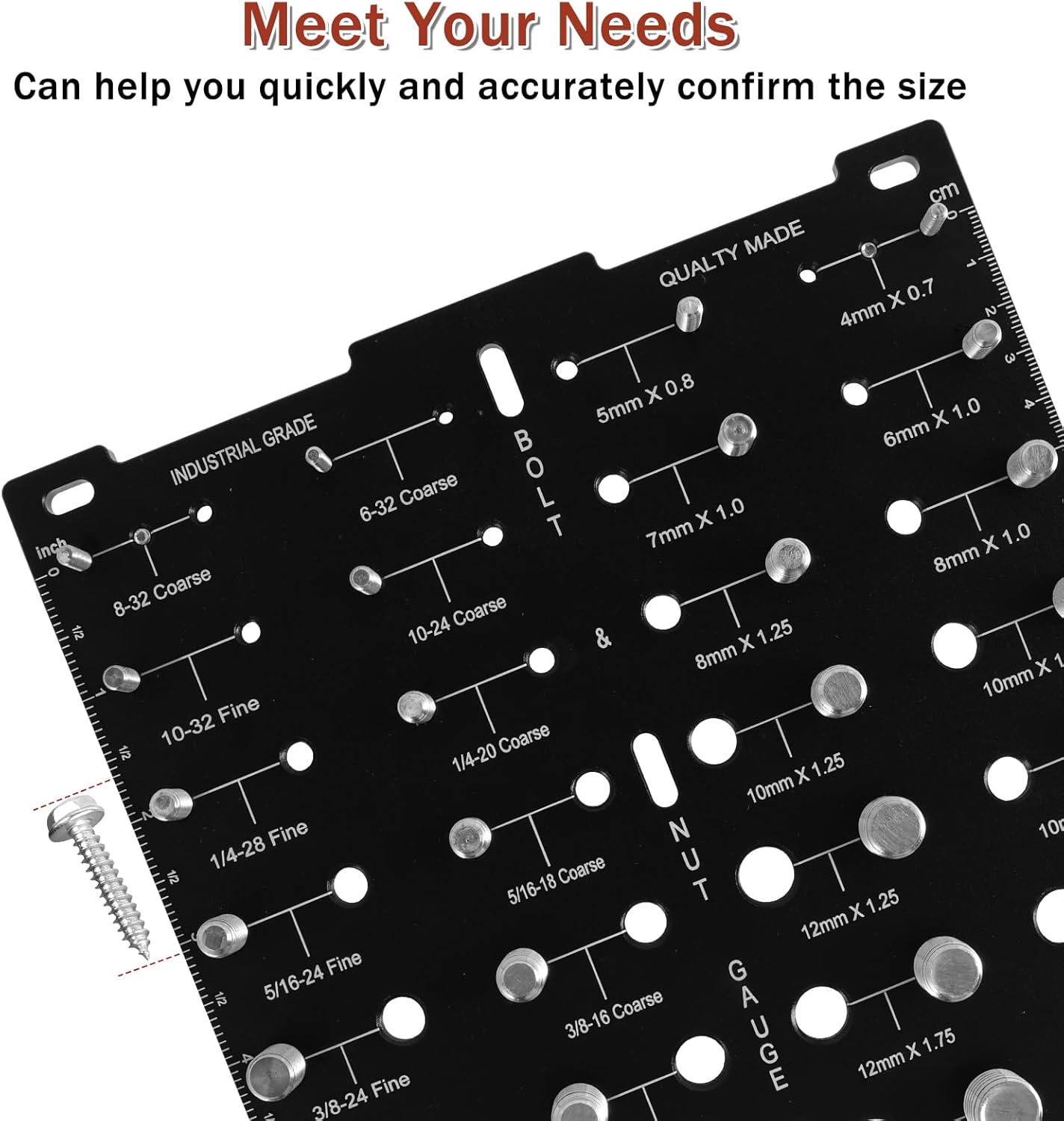 Parts List:1 Set of Nut and Bolt Thread CheckerProduct Specification:Description:Our nut and bolt thread checker set can identify 28 different sizes of nuts and bolts. It adopts clear scales and quick to identify thread sizes. Made of 6061 aluminum alloy material, it is sturdy and enduring, easy to use and can meet your needs.Feature:Easy to Use: Our nut and bolt thread checker is easy to use and quick to identify bolt and nut sizes. Remember to wear gloves to protect both of your hands.Meet Your Needs: This 28 thread identifier gauge can meet your needs of identifying thread size. It doesn't get tangled up like previous coil type identifiers to hamper usage.Specification:Product Name: Nut and Bolt Thread Checker SetMaterial: 6061 Aluminum Alloy, Carbon Steel Nickel-PlatedColor: BlackSize: 198×198×6mmMeasuring range: 1-150Accuracy: 0.01Notes:1.Please be sure to wear work gloves to protect your hands during the comparison process and avoid accidental injuries.2.There may be slight differences between the picture and the actual color of the commodity. We will try our best to show you the exact color.3.Please allow slight dimension difference due to manual measurement.