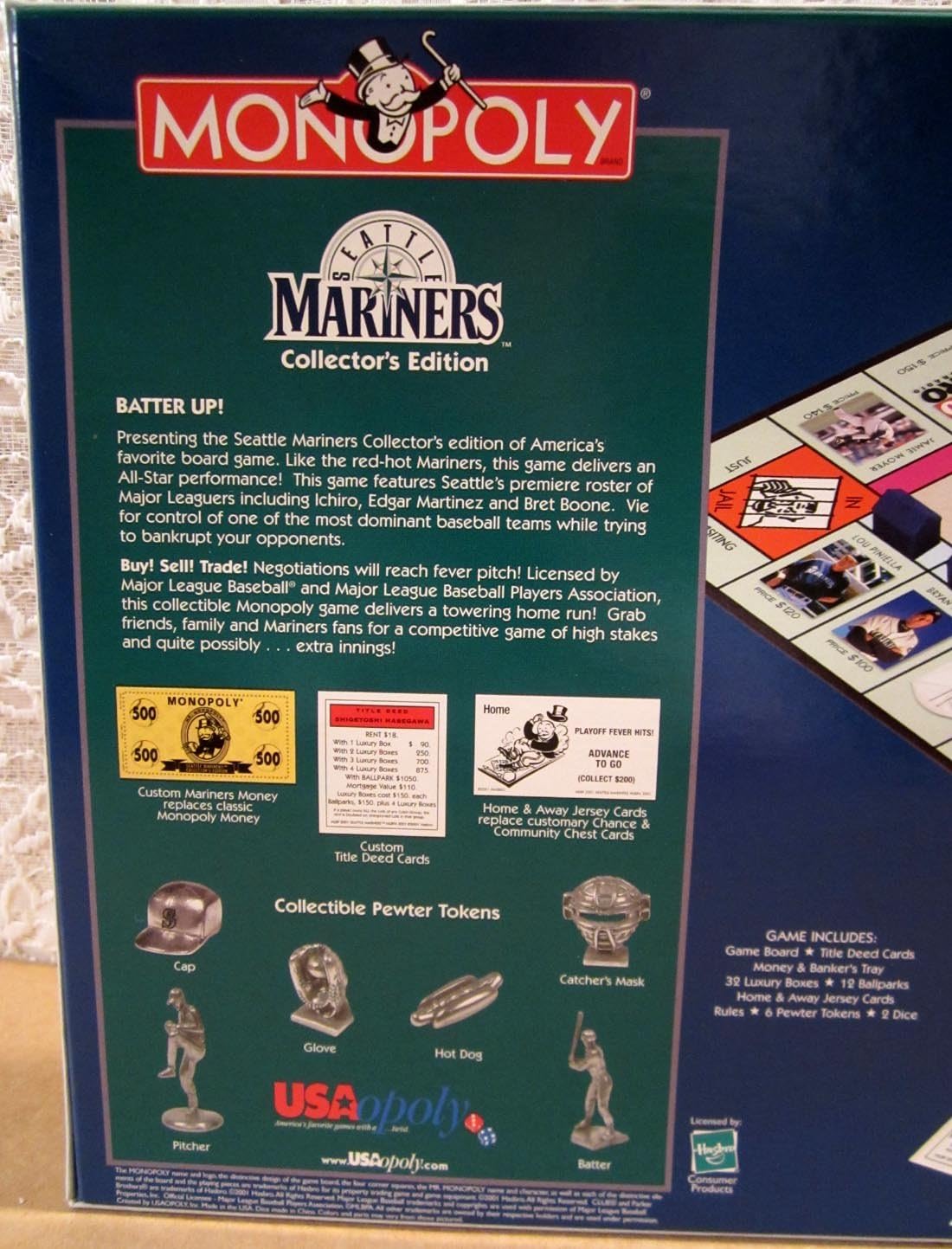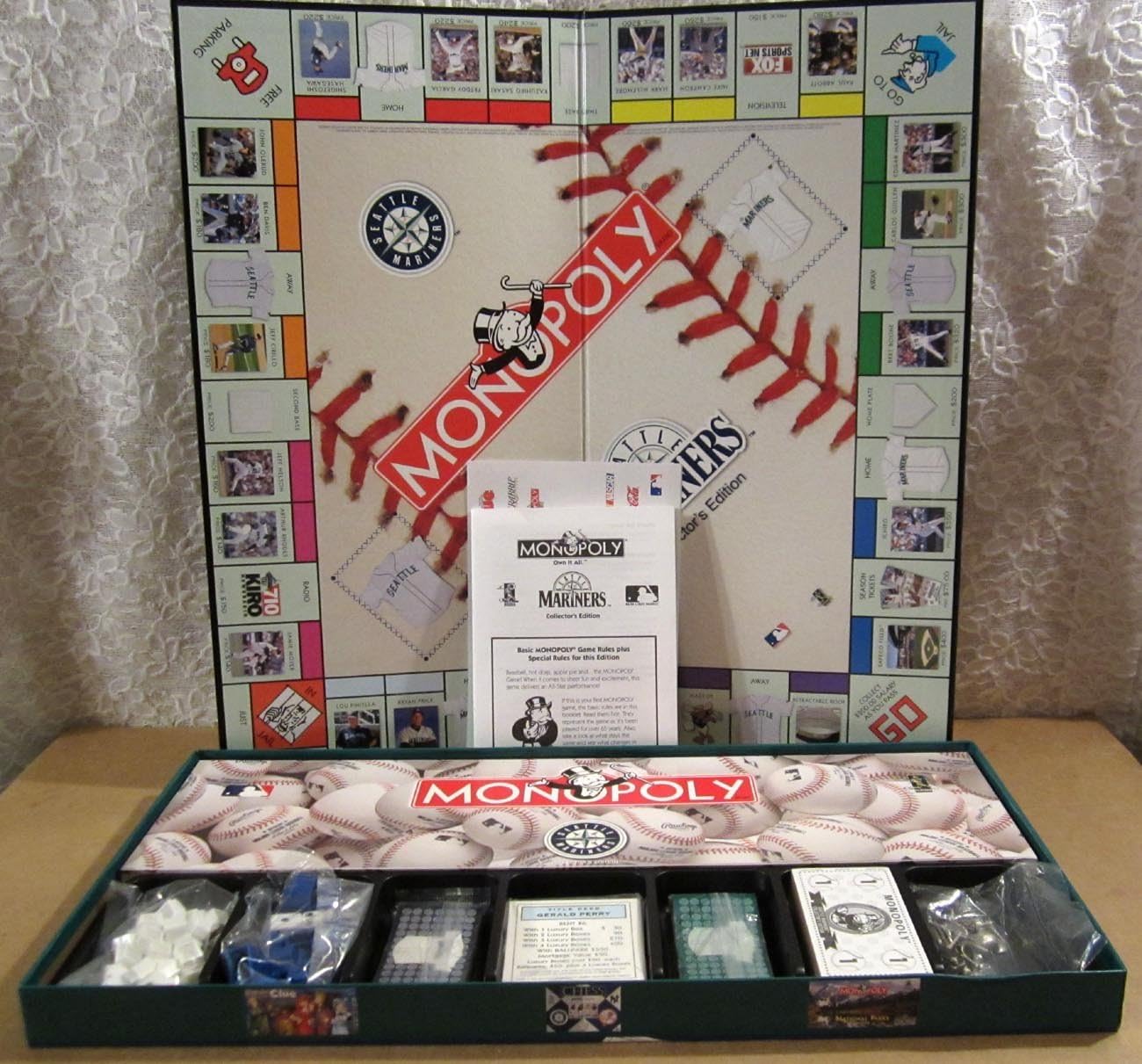 From the Manufacturer Seattle mariners monopoly the seattle mariners collector's edition of the monopoly game features ichiro, bret boone, lou piniella and all the leading mariners players. Play ball! The monopoly game partners with major league baseball to bring you the ultimate collector's edition of the monopoly game featuring the red-hot seattle mariners. From safeco field and ichiro to bret boone and edgar martinez, the best of the mariners is now yours to own! Vie for the greatest mariners assets including key major leaguers like carlos guillen, kazuhiro sasaki and top manager lou piniella. Build luxury boxes and ballparks instead of traditional houses and hotels and bankrupt your opponents! This game comes complete with collectible pewter tokens including a mariners cap, batter, hot dog and catcher's mask. A must-have collectible for the hard-core mariners fan. Game includes game board, deed cards, mariners' money and banker's tray, dice, home and away jersey cards, 6 custom pewter tokens mariners baseball cap, hot dog, ball in glove, pitcher, batter and catcher's mask ages 8 and up