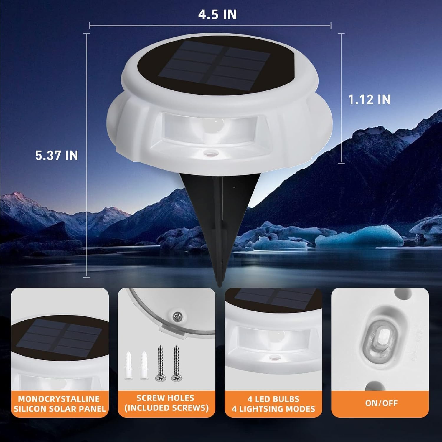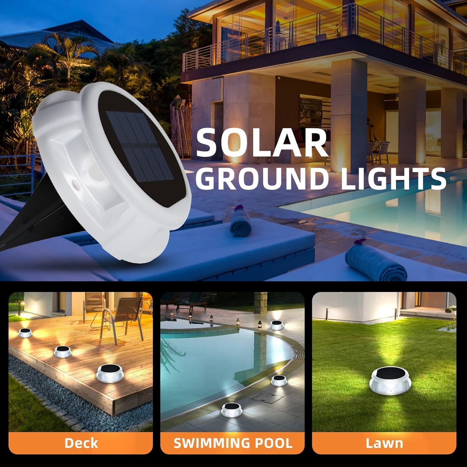 USOKYO SOLAR GROUND LIGHTS LED Outdoor ground solar Lights Decorate Your Life Anywhere. This path light is suitable for all kinds of environment, and can make your garden or any other outdoor location more fashionable and pleasing. High Efficiency And Long Lifetime: Built-in 600mAH large storage battery, with only 6-8 hours charging time in the daytime. It can turn on automatically under terrible weather or at dusk and light up for more than 8-13 hours. DURABLE: the light is IP68 water-proof, is durable under all kinds of terrible weather conditions. INTELLIGENT LIGHT CONTROL The led solar powered in-ground lights automatically light off and charge during the day. Automaticall light up at night ENVIRONMENTAL PROTECTION No power consumption. Solar light garden ground live a low-carbon life with power saving and environmental protection. Warm Tips 1. After receiving the lights, please ensure the lights are switched on before taking them out to gather solar energy. 2.Please leave it in the sun for more than 2-3 days, please contact us in time if it fails to work properly. 3. Before you use the spike, you'd better loosen up the ground a bit with a shovel beforehand or use water to moisten the ground to make it softer. 4. Please make sure the solar panel can get the sunlight directly without any shelter or glass.