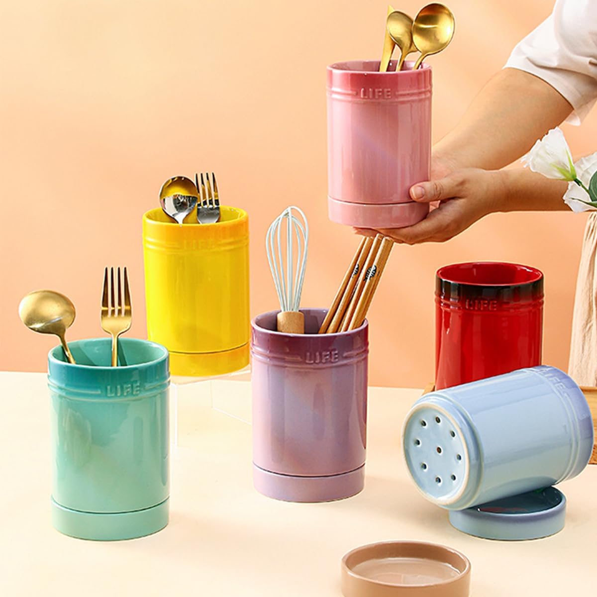 Product DescriptionThis ceramic kitchen utensil holder isn't just limited to the kitchen; its versatile design makes it great for holding wine bottles, fresh-cut flowers, or art supplies. Whether you're outfitting a cozy farmhouse or a modern apartment, this ceramic utensil caddy brings timeless charm and lasting quality to your home.Product name: Rainbow chopstick holderMaterial: CeramicColor: Eight colors availableSize selection: As shown belowWarm reminder: The product is manually measured and there may be an error of about 1-5mmPlease refer to the actual productProduct includes:1pcs