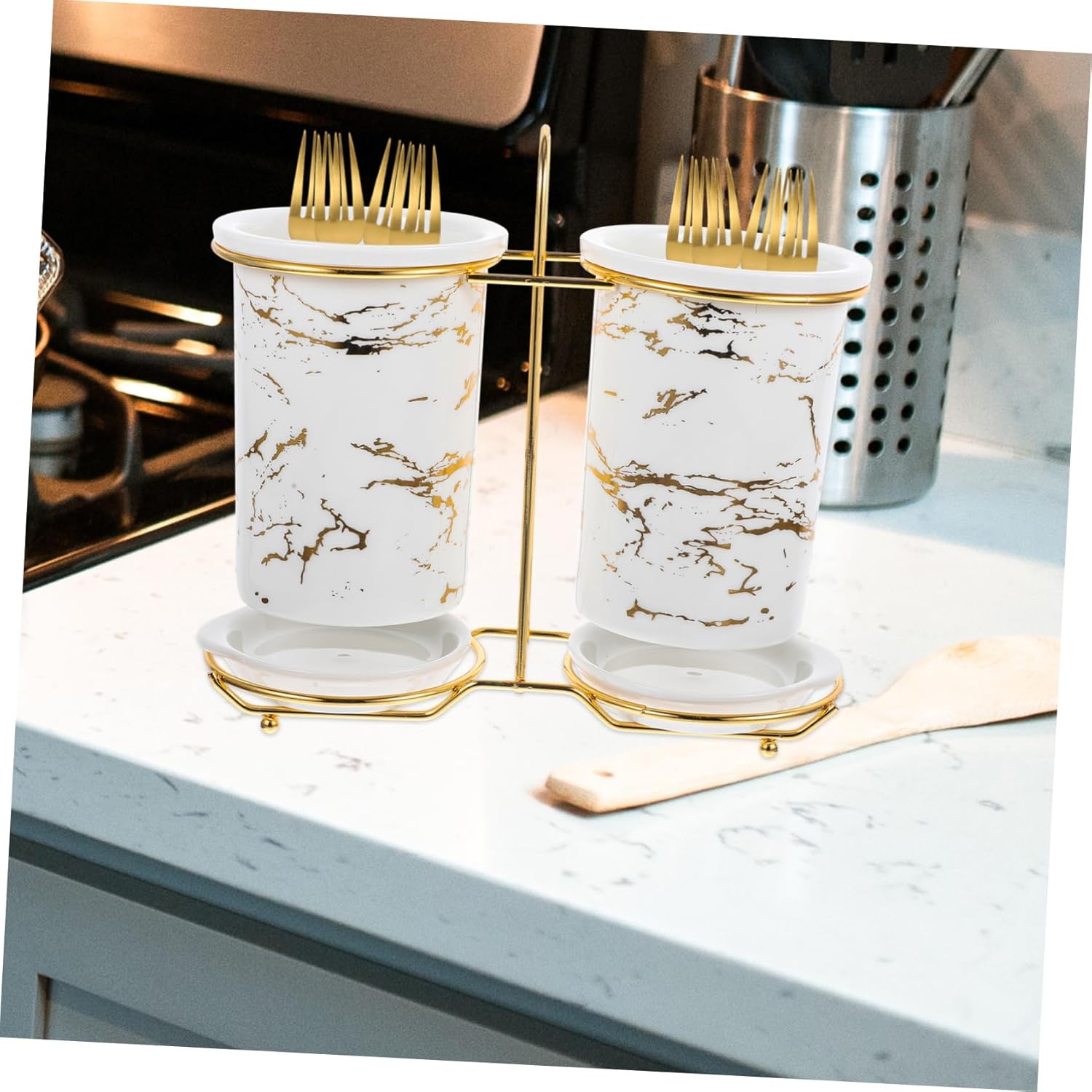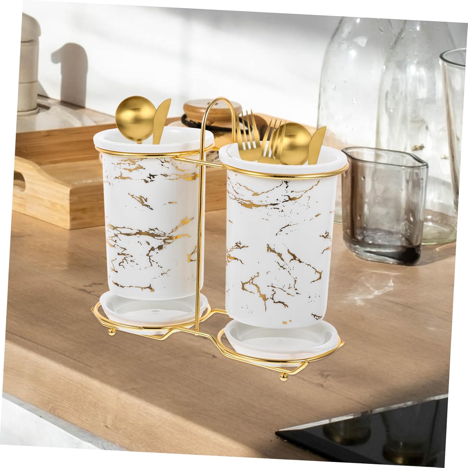 Package Include 1 x iron rack 2 x ceramic chopstick canisters 2 x ceramic trays Characteristics -Size:20.00X19.00X9.00cm/7.86X7.47X3.54in chopsticks rest holder -Color:Black,White forks and spoons organizer -Material:Iron, ceramic kitchen chopsticks organizer - Easy to clean, ventilate and drain. Iron, ceramic material, not easy to be broken forks and spoons holder. - Suitable for storing chopsticks and keeping cooking utensils tidy on the workbench spoons and forks holder. - storing spoons, forks, chopsticks, silverware or other small utensils chopstick holders. - Small and elegant, not , easy to sort and store. Can be used in kitchen, bathroom, etc chopsticks containers. - Ventilating design makes chopsticks or other items get dry quickly, keep your items dry chopsticks holder.Goods Informationchopsticks stand holder The anti-skid tabletop design can hold chopsticks withstand the chaos of any kitchen or busy restaurant environment.chopsticks shelf The chopstick holder has clear appearance and simple design, which can add some beauty to your kitchen and create a clean and tidy kitchen for you