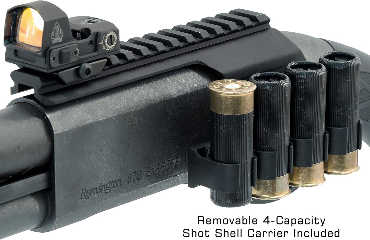 UTG 870 Optic Mount for 12 Gauge Remington 870 and 870DM Mag-Fed Shotguns, 3.5" and Under Chamber Clearance, 6061-T6 Matte Black Anodized Aluminum, Removable 4-Capacity Shot Shell Carrier, Scalloped Full Length Picatinny Top Rail, Access to Bead Sight Left Intact, No Permanent Modifcation Required