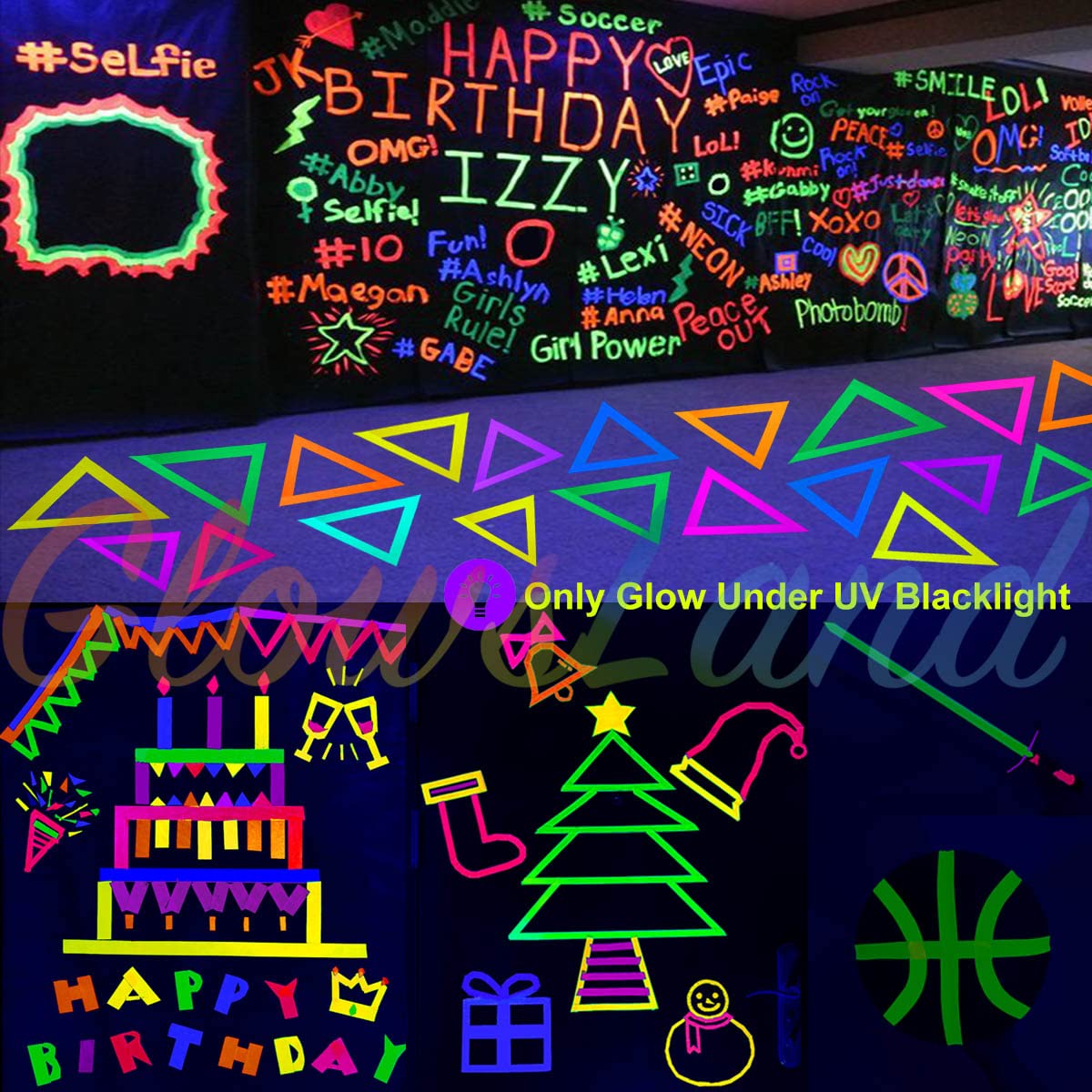 We are ardent fans of the black light party. We have tested a lot of black light reactive supplies, but few of them meet our satisfaction. Some of them are not bright enough, some of them are too small, etc. But here, you can get the better neon tape!1. Ideal supply for black light partyIt is a uv blacklight tape designed for the kid and adult’s black light party and Halloween. You can decorate the walls, floors, windows, dance floor, furniture, and can also be attached to clothing, it can be used for stage performance.2. Better neon tape6 Rolls, 1inch*50ft each roll, including yellow, green, pink, orange, purple and blue. Please note that accessories or parts such as black light flashlights or bulbs are not included . 3. Upgraded glow effects under black lightSix colorful tape glows super bright under black lights. At the same time. these uv tapes look very saturated and colorful in the sunlight. It is an ideal as the blacklight party supplies or Halloween party decoration.4. Mark items and write on itMark various items such as switches, remote controls, charging lines, mobile phones, even stairs, exits, etc. Its bright colors make things easy to recognize and keep organized. It can even be made as arrows indicating where people can go in the house under the blacklight.5. Our customer serviceIf there is any dissatisfaction, please contact us.