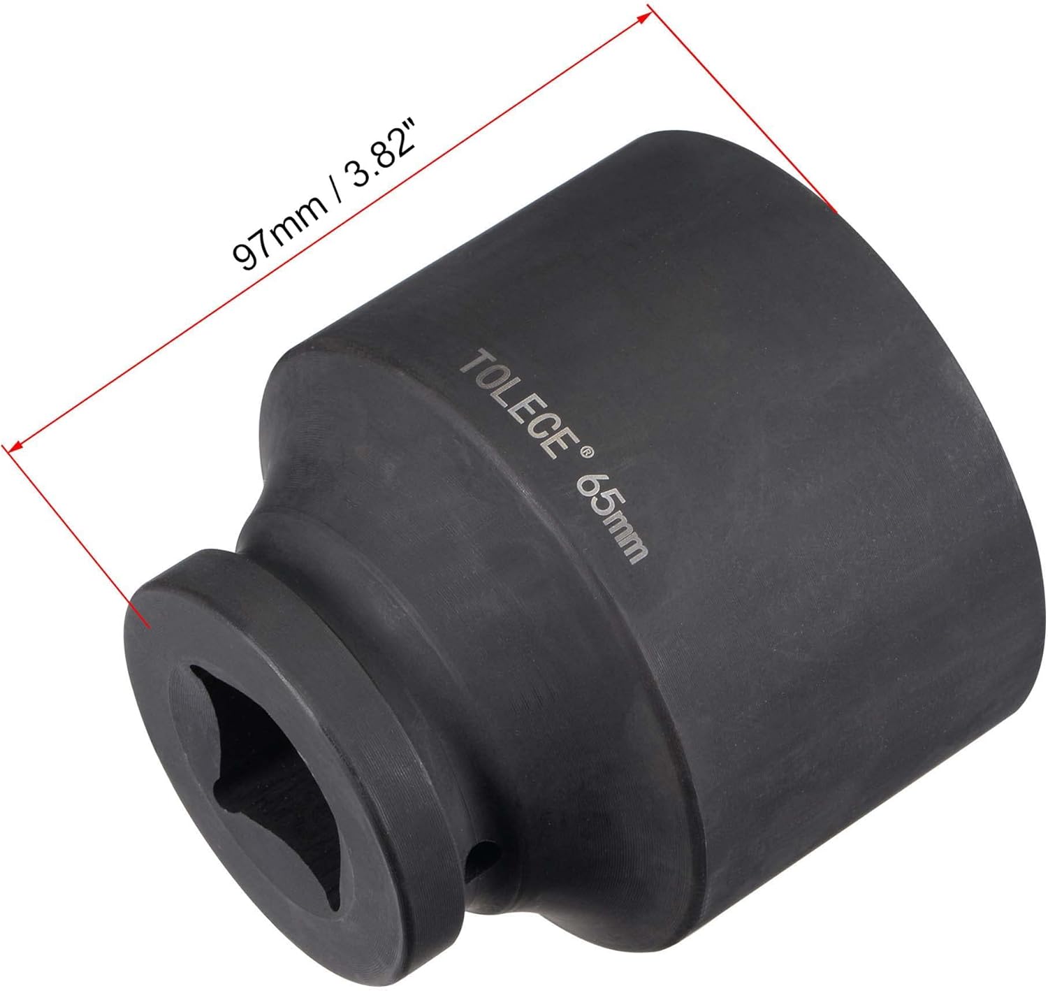 * Made of chrome-moly steel construction for strength and durability.* To prevent rust and corrosion, the black phosphate finish absorbs and retains oil, repelling moisture.* 12-point opening is suitable for double hex (12-sided), hex and square fasteners, can grab fasteners quickly at multiple angles.* To prevent round-off under stress, it grips the flat sides of fastener heads instead of the corners.* The through-hole at the drive end locks on the tang of drivers or impact wrenches, so it won't fall off or stick on the fastener head.* Widely used in DIY hand-making, household maintenance, and most general repairs.Specifications:* Socket Size: 65mm* Drive Size: 1-inch* Total Length: 97mm / 3.82-inch* Material: Chrome-Molybdenum Steel (CR-MO)* Finish: Black Phosphate* Color: BlackPackage Content:* 1 x Impact Socket