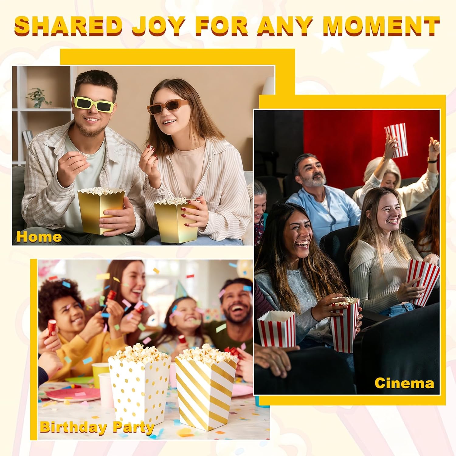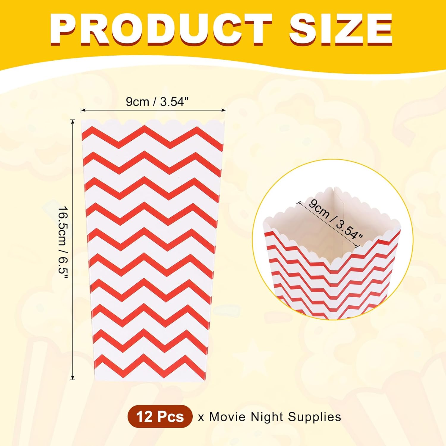 Description:Material: Crafted from a sturdy, 250gsm paper, these popcorn boxes are non-harmful, odorless, lightweight, greaseproof, and clean, allowing them to directly contact food. They are not easy to tear or fade, providing you with a good usage experience.Leakproof & Spacious Design: These popcorn containers feature a leak-resistant design to prevent oil or butter from seeping through, with reinforced side seams for enhanced durability. Additionally, they offer enough capacity for large portions and feature a wide top for easy filling and portion control.Easy to use: Simply unfold the pre-creased popcorn bucket along the scored lines for instant setup. The self-standing base stays stable when filled, and the wide rim makes it comfortable to hold during use, helping prevent spills.Multiple Use: These popcorn bowls are perfect for serving a variety of snacks such as popcorn, french fries, cookies, candies, chocolates, and veggies or hot dogs. They fit at events like movie nights, birthday parties, carnivals, weddings, holiday gatherings, amusement parks, snack stores, gardens, dessert tables, and use at home. They are also suitable for graduations, congratulations, Thanksgiving, Easter, Father's Day, and Mother's Day.Specifications:Color: RedMaterial: PaperSize: 9 x 9 x 16.5 cm / 3.54 x 3.54 x 6.5 Inch (L x W x H)Package Content:12 Pcs x Movie Night Supplies