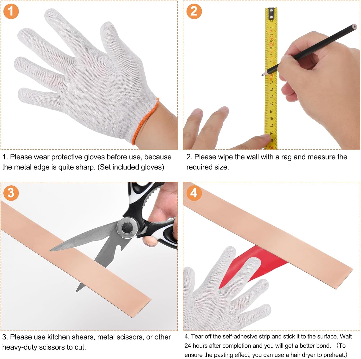 Great choice to decorate your bathroom, bedroom, kitchen, TV background wall, ceiling, border, cabinet, mirror and more.Specification:Material: 201 Stainless steelColor: Rose GoldLength: 16.4 ft (5m) Thickness: 0.15 inch (0.4cm) Width: 3.2 inch (8 cm)Package Included: 1 set x self adhesive molding trim; 1 pcs x gloveAdvantageOur self-adhesive molding trim is made of 201 stainless steel, flexible, waterproof, corrosion-resistant and scratch-resistant, easy to clean with a wet towel.Cut the required length and shape according to the plan, cut into 45 degrees angle for corner finish. Strong self-adhesive, simply peel and stick, no glue and nails are needed.Please clean up dust and water before installation. Do not stick it on dusty or uneven walls; Use a hairdryer to heat the adhesive strips for better sticking effect before installation.Apply to any flat and smooth dry corner surface such as tile, plastic, marble, metal, glass, wood, smooth wall. and so onNote: Do not touch immediately after installation, please wait for 24 hours before use;