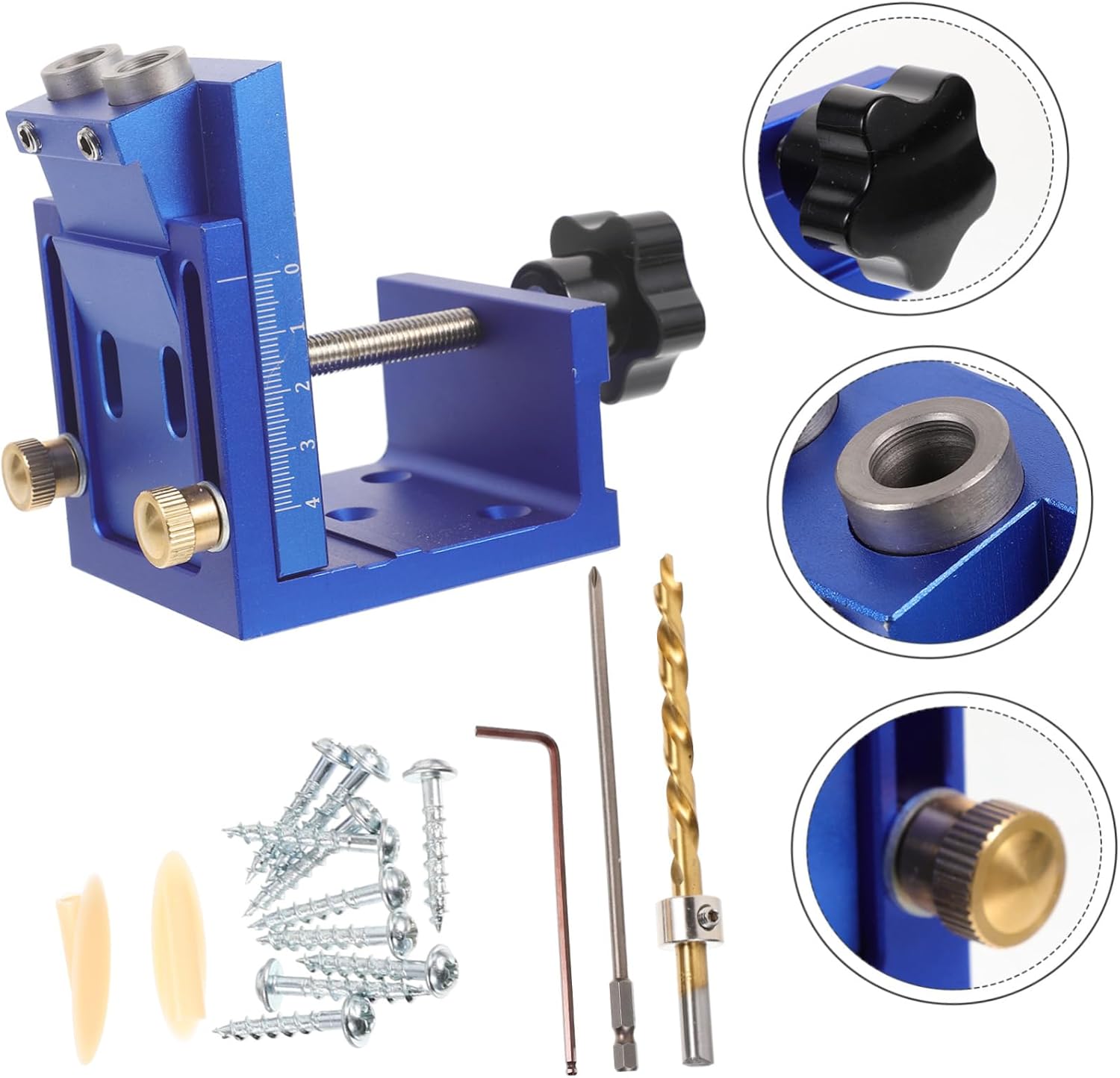 Package List 1 x locator 10 x plugs 1 x drill bit 1 x bit 1 x wrench x screws Features Clamping range: 1-38mm woodworking tool accessory -Material:Aluminum alloy pocket hole drilling jig - Size: 13.20X9.80X6.50cm/5.19X3.85X2.55in pocket hole jig kit Applicable plug diameter: 9mm pocket jig - Color: Blue, Random Color Accessory woodworking hole jigs - The positioning fixture has a larger chip removal capacity, faster and smoother chip removal, faster and less labor-saving drilling multifunctional guide tool. - Drilling locator guide rail with quick clamp, fast and firm clamping, drilling efficiency drilling guide. - The extended drill sleeve of the woodworking fixture makes the punching accurate, the 15-degree inclined hole, the splicing is more firm, and the applicable plug diameter is 9mm woodworking hole opener. - Drilling guide rail, with clear and precise scale, can be adjusted to a suitable position according to the thickness of the wood, and accurately aligned, suitable for wood thickness 12-38mm drill bit leveling guide. - Made of aluminum alloy, anti- , wear- and strong, small and light, used for splicing furniture and wood boards woodworking tool.Goods Informationprecision positioner Features the aluminum alloy material, which has high durability, to deform.tools for woodworking Fine workmanship, ensures practicality.multifunctional guide tool This pocket hole set is made of , which can withstand long-lasting use