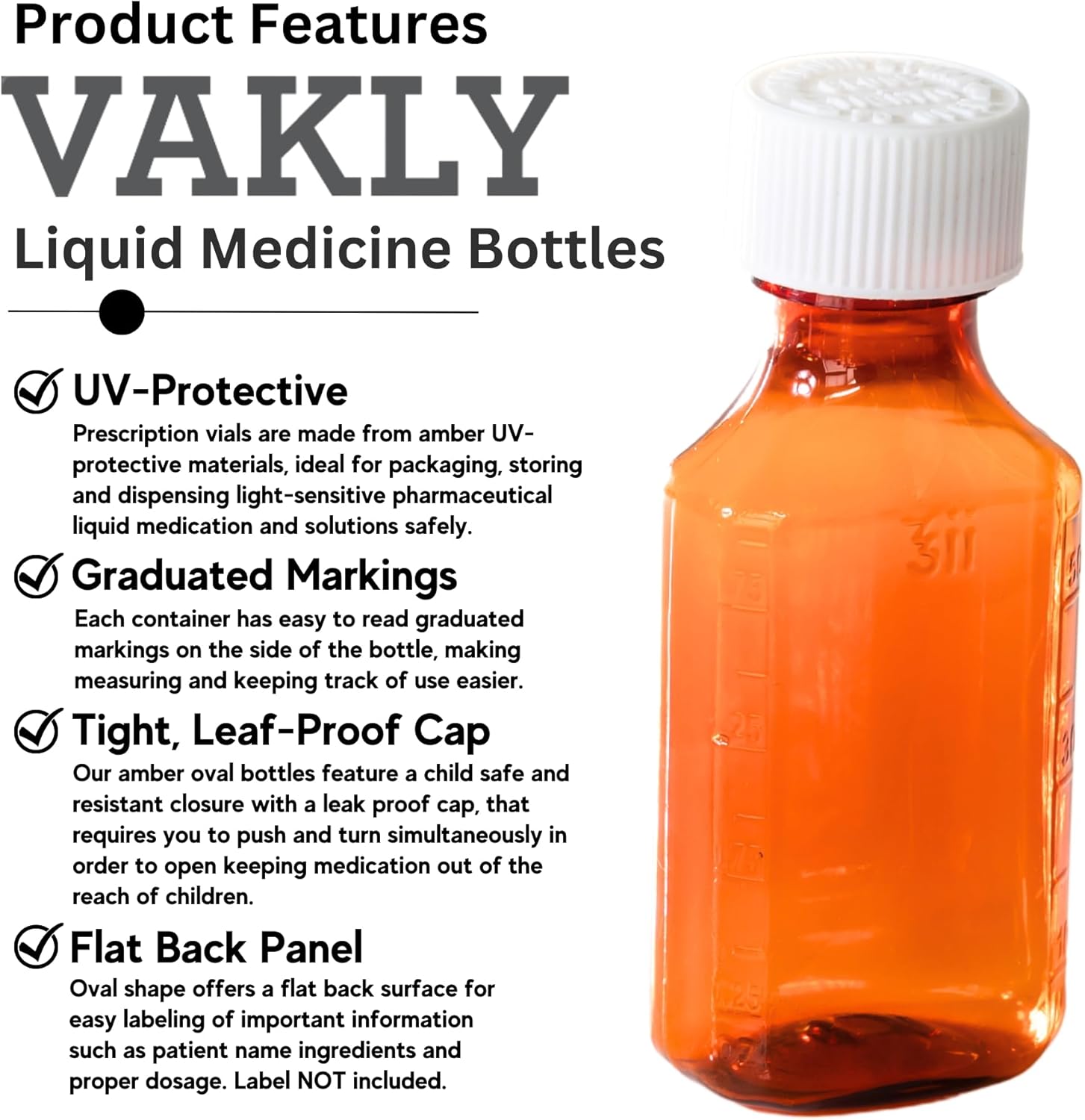 SAFE AND SECURE - Our amber oval bottles feature a child safe and resistant closure with a leak proof cap, that requires you to push and turn simultaneously in order to open keeping medication out of the reach of children. GRADUATED AND TRANSLUCENT – Each pharmacy container has easy to read graduated markings on the side of the bottle, making measuring and keeping track of use easier, which is crucial for knowing when to refill. UV-PROTECTIVE – Prescription vials are made from amber UV-protective materials, ideal for packaging, storing and dispensing light-sensitive pharmaceutical liquid medication and solutions safely. FLAT BACK PANEL – Oval shape offers a flat back surface for easy labeling of important information such as patient name ingredients and proper dosage. Label NOT included. BOTTLE DIMENSION – 2 Oz (4 inch tall x 1.75 inch wide x 1 inch thick) 4 oz (5 inch tall x 2 inch wide x 1.5 inch thick) 8 oz (6 inch tall x 2.5 inch wide x 2 inch thick) Bottle neck opening for all sizes ¾ inch.