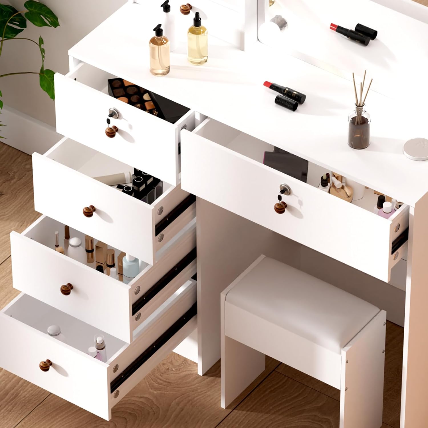 Product specification SheetColor: WhiteMaterial: MDFNumber of Drawers: 5Open Vertical Storage Shelf๏ผ1Hidden Storage Shelf: 1Overall Dimension(LรWรH): 31.5x 14.2 x 51.6inches80 x 36 x 131 cmProduct Weight: 63bls28.5 kgsPackaged Included :1x Vanity Table1x Power Outlet1x Cushioned Stool1x 10 Light Bbulb Set1x Assembly InstructionsAssemble Needed: YesIf you have any questions during the assembly process, please feel free to contact us.