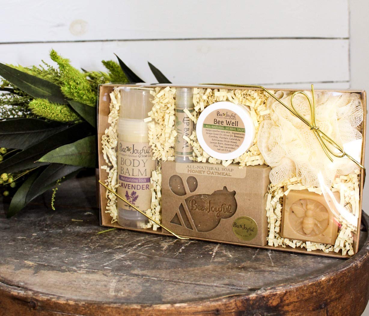 This Gift Box is made up of a variety of our most popular handmade items. This item includes: One Lavender Body Balm Lotion Stick, one Bar of "Lavender Blossom Soap", one Vanilla Lip Balm", one "Bee Well Herbal Salve" 0.5 oz. A smaller decorative bee soap and a soap saver draw sting soap cloth. NOTICE: Items that come in this gift box are as described here and may not match items seen in the image exactly. Bee Joyful products are all handmade with 100% natural ingredients, including beeswax, honey and pure essential oils. This is the perfect gift to bring joy AND clean healthy skin!