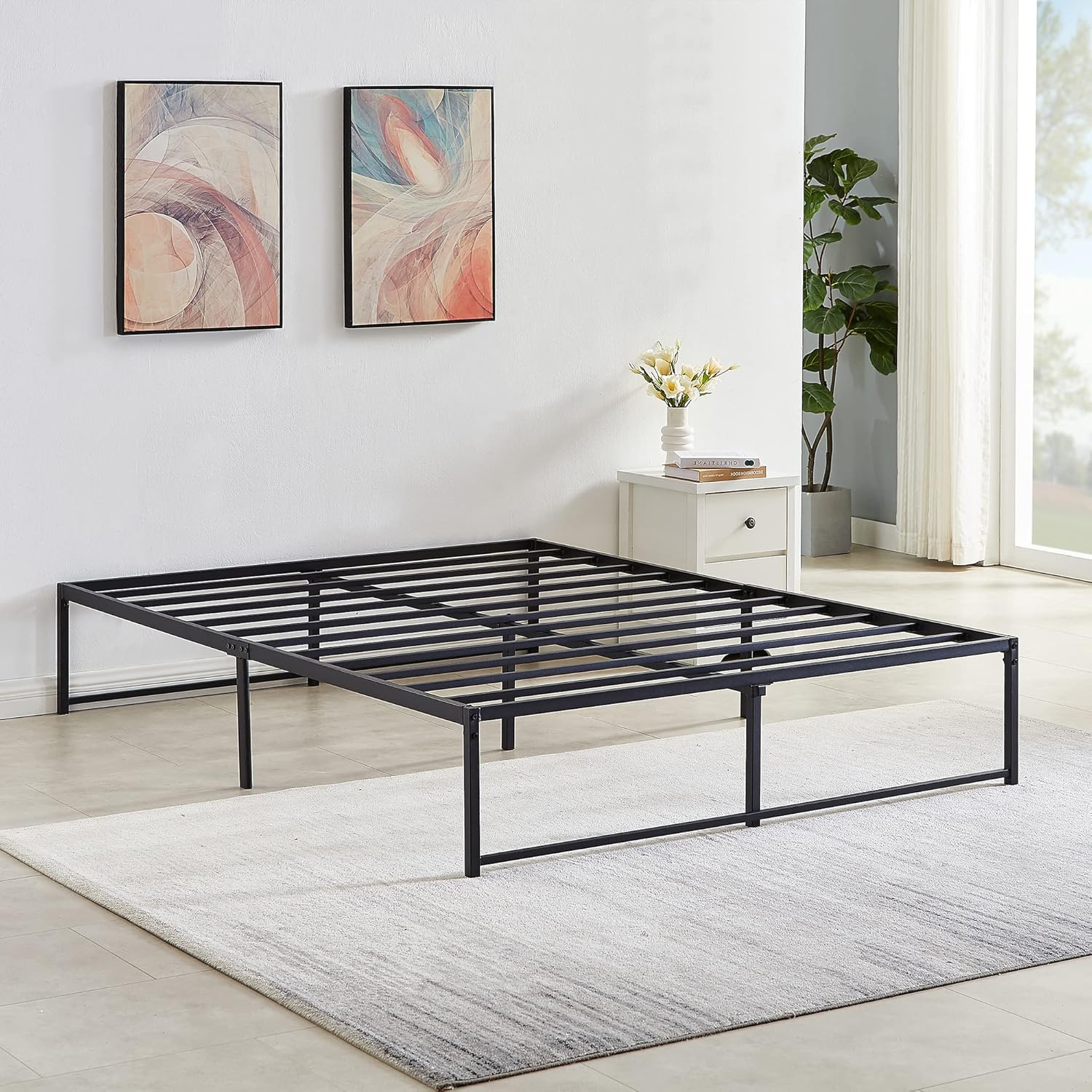 What are our advantages?NO Boxing Spring NeededCost Effective12.6 in under bed clearanceEnhanced Metal LegsExcellent Customer-ServiceSpecifications:Bed Frame Color:BlackRecommended Mattress Size: 75 x 39 in (Twin ) 75 x 54 in (Full ), 80 x 60 in (Queen ),80 x 76 in (King )Max Load: 3000 lb(twin), 3000 lb(full), 3000 lb(queen),3000 lb(king)Package Includes: 1 x Bed Frame1 x Instruction1 x Assembly KitTips:Do not tighten screws until fully assembled.Make sure the legs remain in contact with the ground.Mattress is not includedCheck all screws or bolts are tightened and inspect regularly.