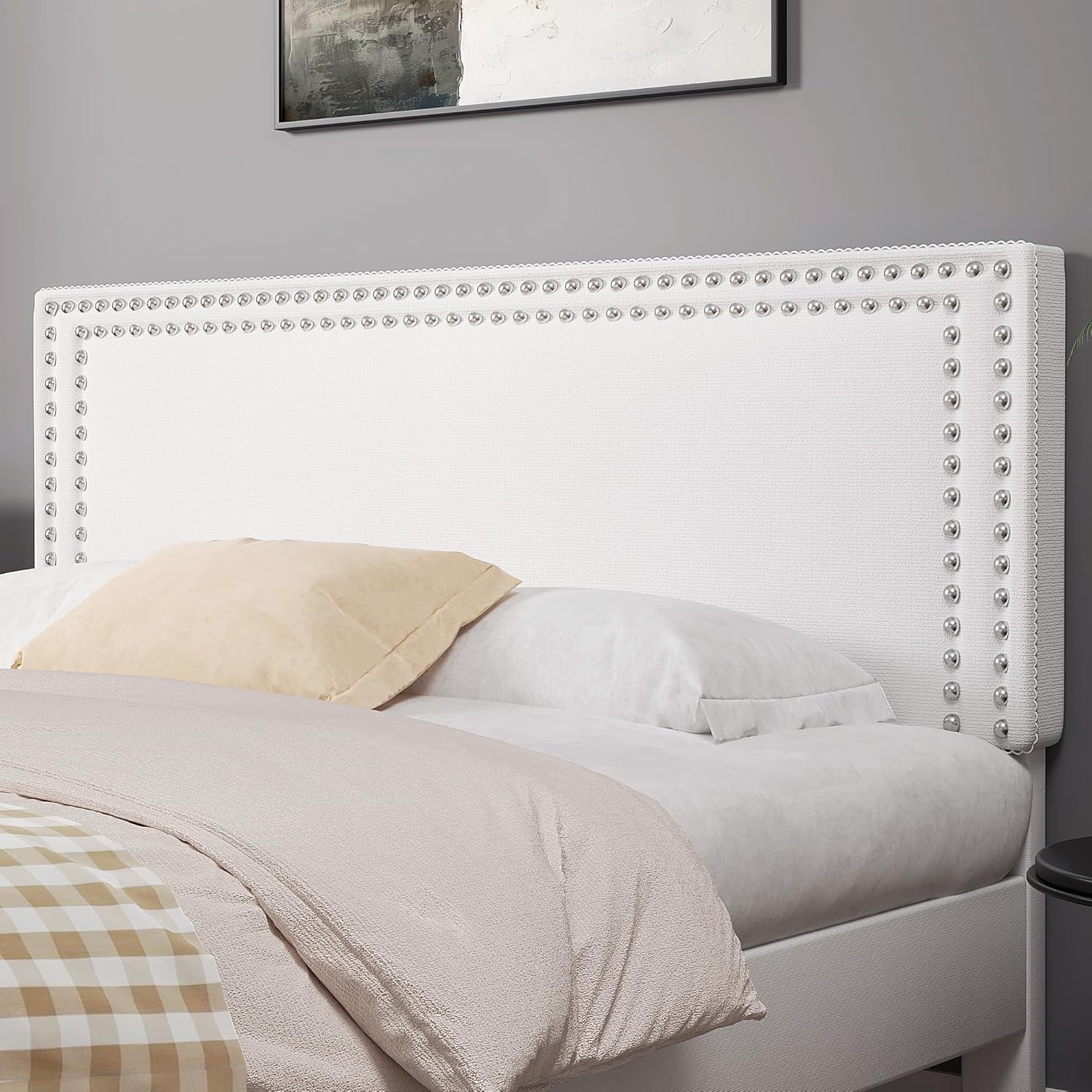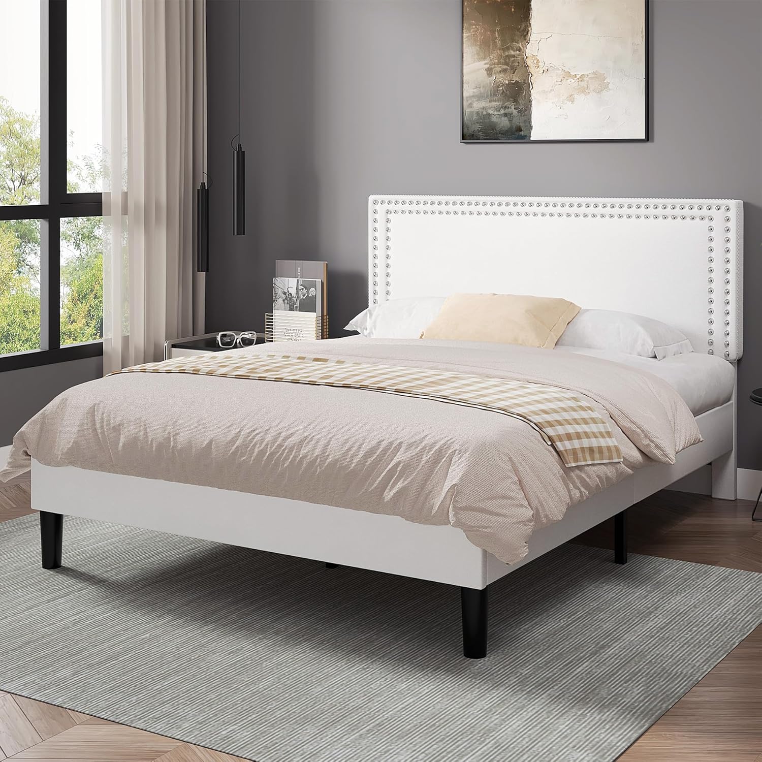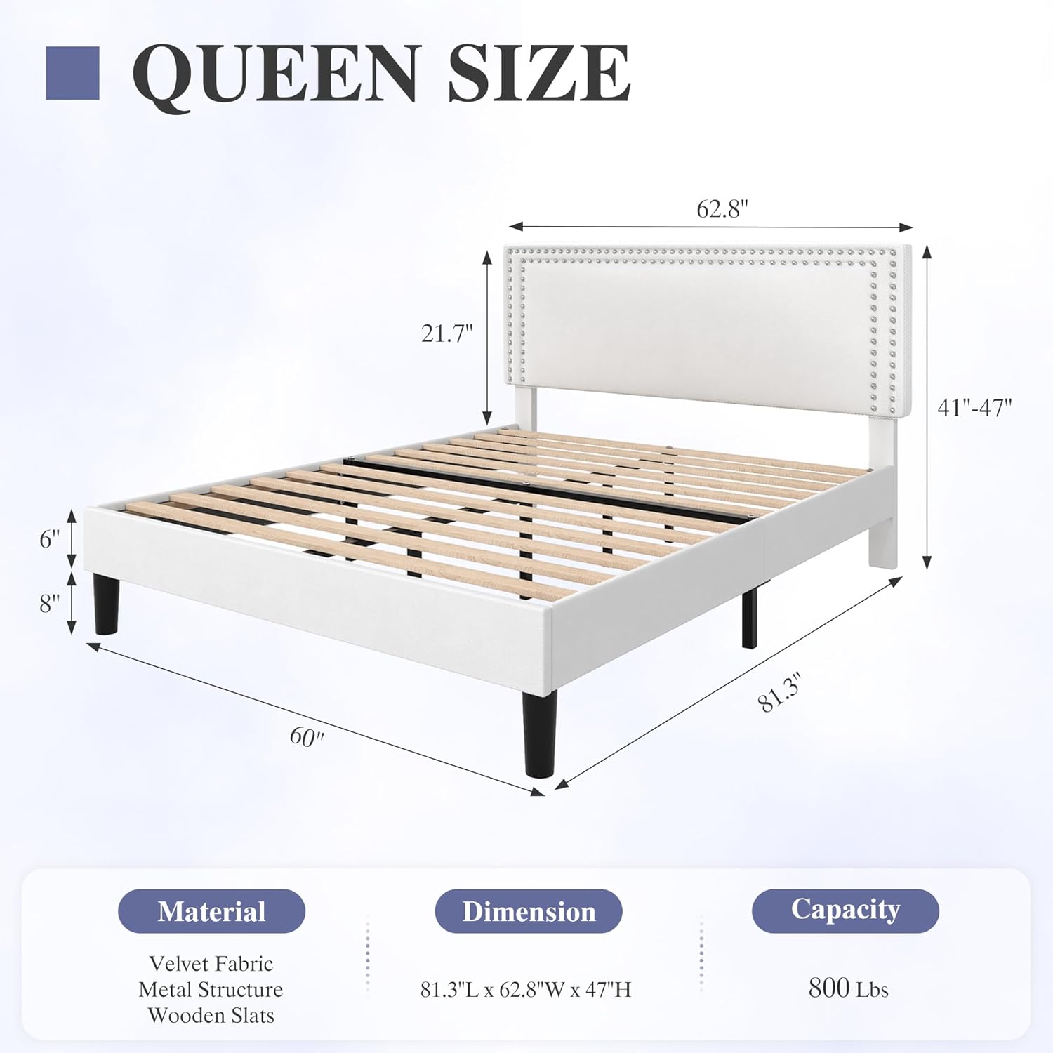 This bed frame is designed with an elegant velvet padded and nailhead decor making it a style statement bed that adds character to your room.Product Overview:- The thickened headboard with high-density foam inside is luxurious to the touch and feels so comfortable when you lean on it. Adjustable height of 4 levels could handle most types and thicknesses of mattresses.- 7.8" under-bed space for you to store suitcases, shoes, boxes, and more. Help keep your room space tidy and well-organized. The away-floor height also makes the under-bed area easy to clean up.- A mattress can be placed directly on the solid slat system, negating the need for a box spring. The bedstead is composed of 12 wood slats and metal supports. We added extra metal legs which are different from other beds making the max loads up to 800 pounds to provide excellent support for your mattress.- Between slats and metal frames, we use soft foam padding for lower friction to bring you a noise-free bedding time. No more squeaky around ears when making movements. - The assembly of mid-frame with legs and 2 side rails is foldable. With velcro wood slats design. And all tools included, it is easy to put all the components together; you don't even take more than an hour to assemble it. (Pillows, quilts, mattresses, etc. are not included. )This bed frame makes your room gorgeous and shows the uniquely modern style of the house owner, bringing elegance and sophistication to your bedroom.Dimensions:Distance between the outside frame rails that connect to the headboard and footboard. Twin size: approximately 39.7 inches. Full size: approximately 53.9 inches. Queen size: approximately 60 inches.The max height from the floor to the outside of the headboard is 47".4 adjustable level of headboard height is 41'', 43'', 45'', 47''.The height of the footboard to the floor is 14".Under-bed Height: 7.8"Weight Capacity for Twin is 500 lbs.Weight Capacity for Full & Queen: 700&800 lbs.Package Dimensions for Twin Size: 42.72 x 24.61 x 5.5 inchesPackage Weight for Twin Size: 56 lbsPackage Dimensions for Full Size: 57.68 x 22.64 x 4.9 inchesPackage Weight for Full Size: 64.6 lbsPackage Dimensions for Queen Size: 63.58 x 22.64 x 4.9 inchesPackage Weight for Queen Size: 71.43 lbsNOTE:6/8/10/12-inch mattresses are recommended.Please re-tighten all screws when you finish the installation.If there's any problem with the products you received, please feel free to contact us to get free replacement parts or a brand-new item.