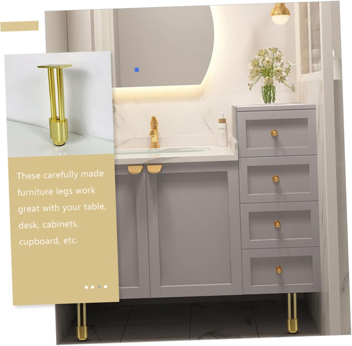 Package List 4 x Furniture Legs Features -Product Info:Bathroom cabinet feet - Size: 12.00X4.00X2.50cm/4.72X1.57X0.98in - Color: Golden -Material:Aluminum alloy -Use them to replace old and broken furniture feet, easily give your furniture has a new look height-adjustable furniture feet. -Reasonable adjustable design, easy to use, can be fixed on the table leg more easily, not easy to skid metal cabinet legs. -These carefully made furniture legs work great with your table, desk, cabinets, cupboard, etc leveling table legs. -Prevent your furniture from shaking or tilting, a great furniture replacement legs table leveling feet. -The aluminum alloy material with a good load capacity enable these furniture feet to be used for long time.Goods Informationtable legs adjustable Suitable for kitchen cupboard, bedroom closet, living room sofa, bedside table, study room desk, etc.furniture support legs Made of premium aluminum alloy, durable and sturdy, fine workmanship ensures its practicality.adjustable furniture leg It can be quickly and easily installed without damaging your furniture or spending you much time