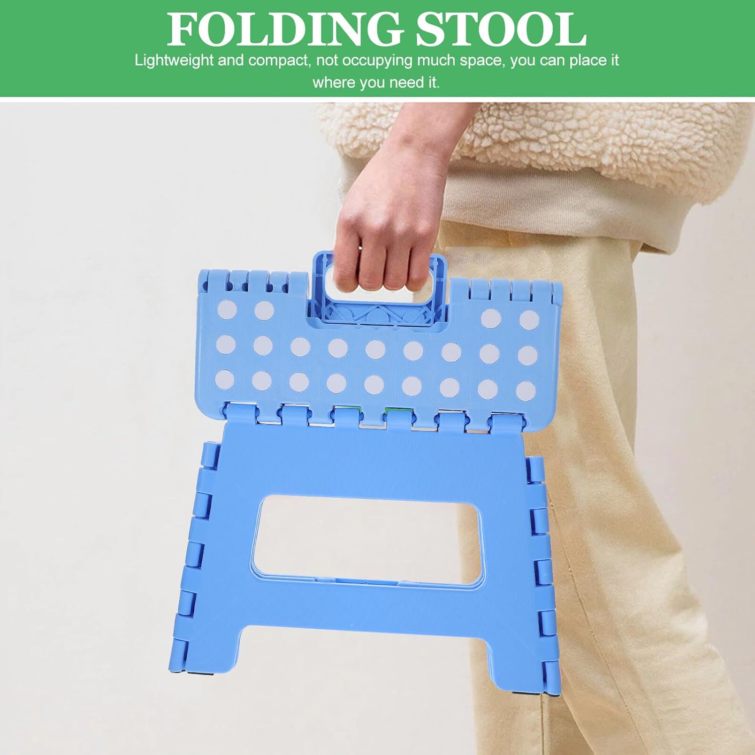 Package List 1 x stool Characteristics - Size: Approx. 29 x 22.8 x 22.5 cm / 11.41 x 8.98 x 8.86 inch. - Material: Plastic. - Color: Blue. -Product Info:Folding bench - Foldable and lightweight design, you carry and organize it easily Folding Stool. - It saves your homes space perfectly and has strong load-bearing ability Small Foldable Stool. - Round chamfers do not hurt hands, safe and practical Home Foldable Stool. - Made of plastic material, and practical for use. - Suitable for home or travel etc.Goods DescriptionFolding Stool Foldable and lightweight design, you carry and organize it easily, suitable for home or travel etc.Folding Taboret Round chamfers do not hurt hands.Bathroom Foldable Stool It also saves your homes space perfectly and has strong load-bearing ability.Pure Color Folding Stool Made of plastic material, this folding stool is and practical for use