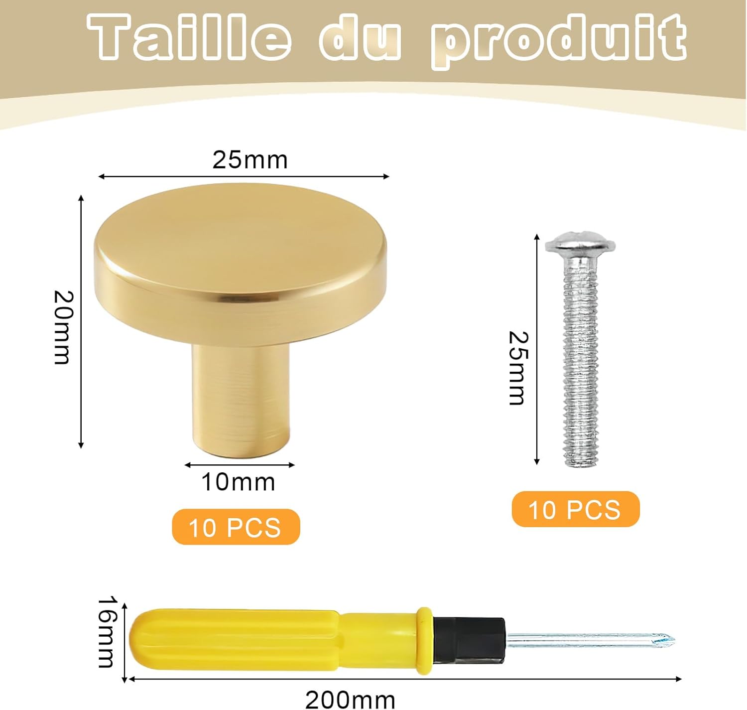 VEGCOO Door Knob Set Specification: The set contains: 10 door knobs + 10 screws + 1 dual-purpose screwdriver Colour: Gold Size: as shown in the picture Material: aluminium alloy. Notice: Due to manual measurement, there may be slight errors in size, please understand. Due to differences in light and display, there may be slight color differences, please refer to the actual product.