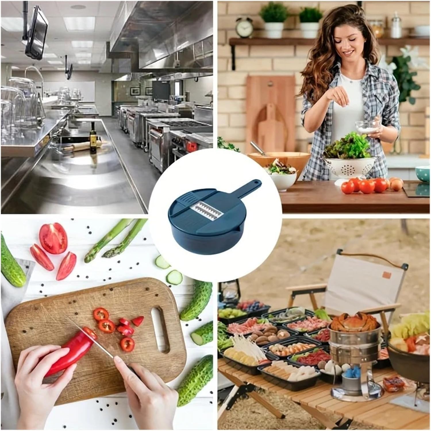 This vegetable chopper includes a set of blades for slicing, shredding, and grating. It works on carrots, onions, potatoes, and other common vegetables. The unit comes with a container that catches food as it is cut.Blades are removable for cleaning. Hand washing is suggested. The chopper sits on a countertop and operates with hand pressure.